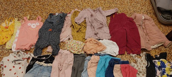 Lot fille 18m bon état voir très bon état. Certain vêtements porté 1 ou 2 fois seulement Multisaison, multimarques 1 maillots de bain 3 combishort été orchestra 2 combishorts TAO manches longues très peu porté 2 combi pantalons légère état correct 1 combi pantalon hiver 1 manteau orchestra hiver Peu porté 1 pyjama coton 1 short, 1 jupe short correct 9 pantalons 4 robes 5 gilets 6 t shirt mc 8 t t-shirt ml