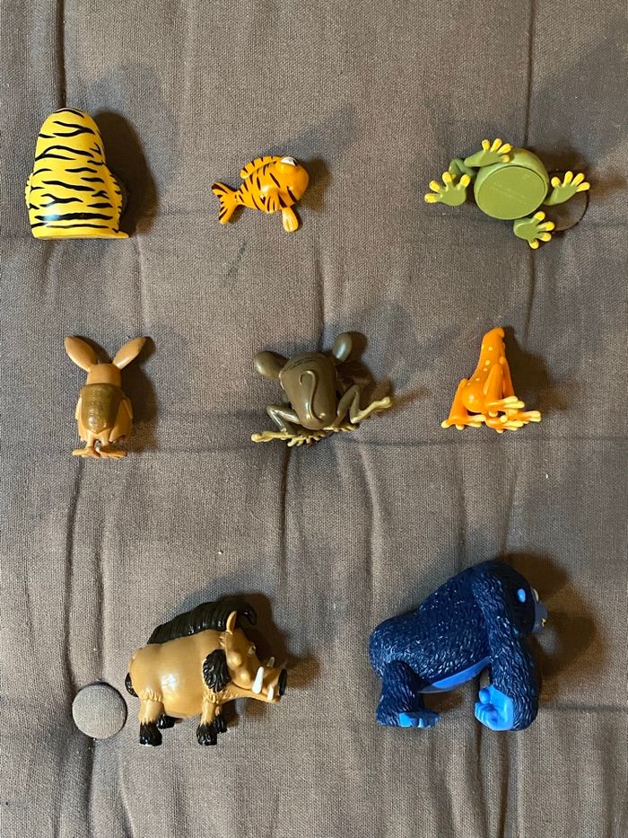 La collection des 8 figurines Les As de la jungle à la rescousse est complète. Maurice le guerrier tigre, Junior le poisson tigre, Gilbert le tarsier, Batricia la chauve-souris, Miguel le gorille, Fred le phacochère copain cochon, Al le crapaud orange et Bob le crapaud vert. Compatibles avec le repaire des As. Idéal pour les fans qui veulent partir en mission Prix non négociable D'autres figurines des As de la jungle dans mon dressing.