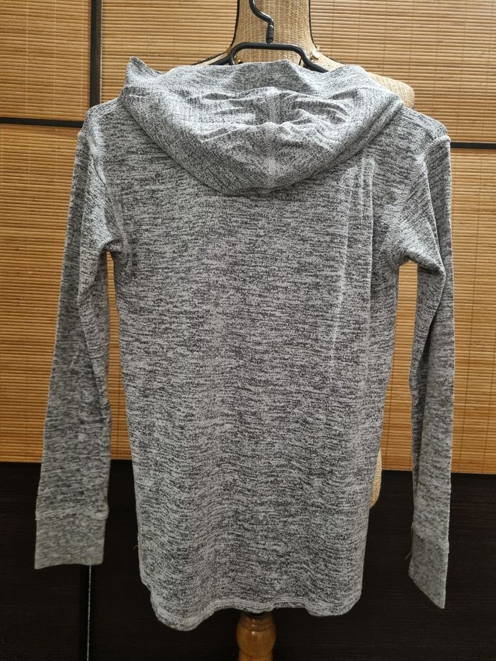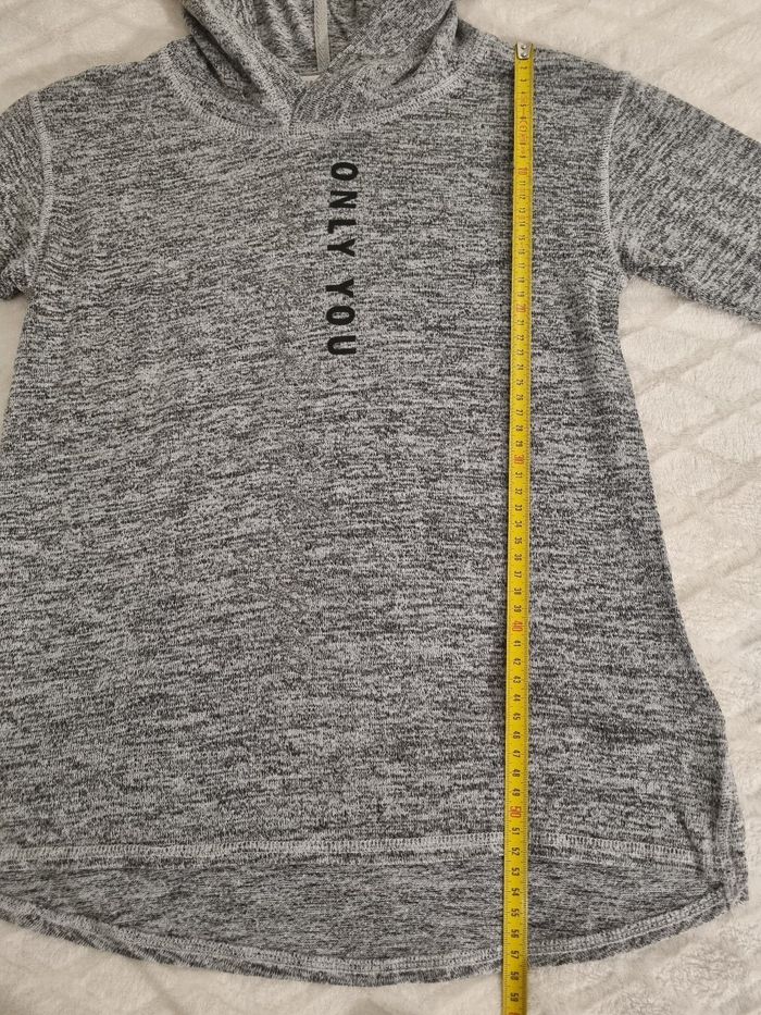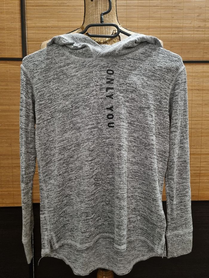 Pull léger à capuche Gris clair avec écritures noires et argentées sur le devant. Un peu plus long à l'arrière H&M 10/12 ans Pas de tâche, pas de trou, pas de défaut à signaler