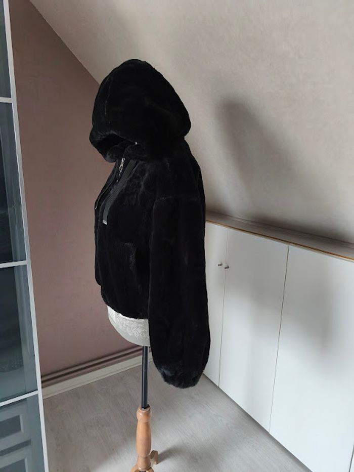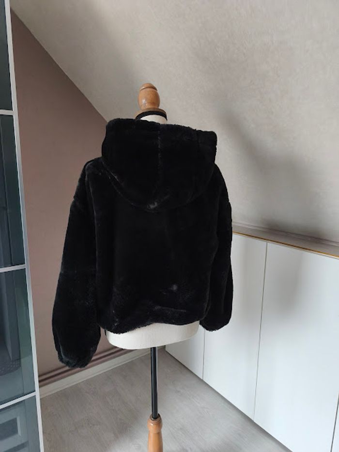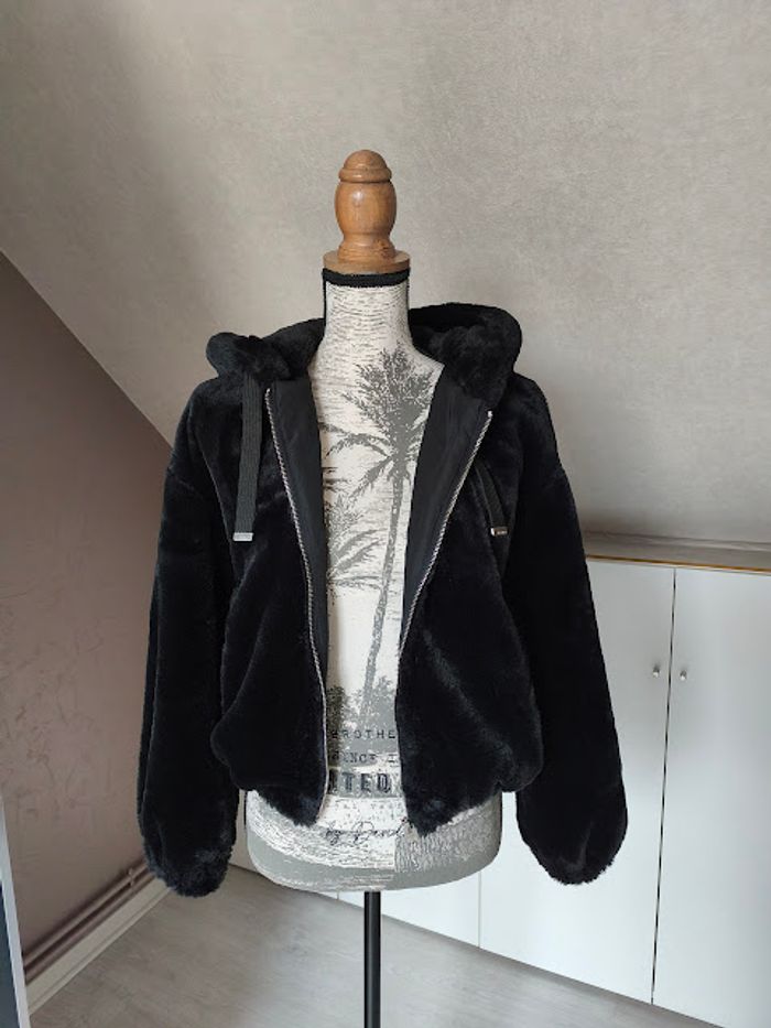 Veste , blouson à capuche, fermeture éclair, cordon à nouer, 2 poches côté, effet fourrure, tout doux, excellent état, portée une fois