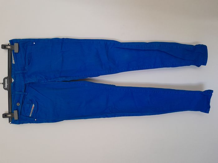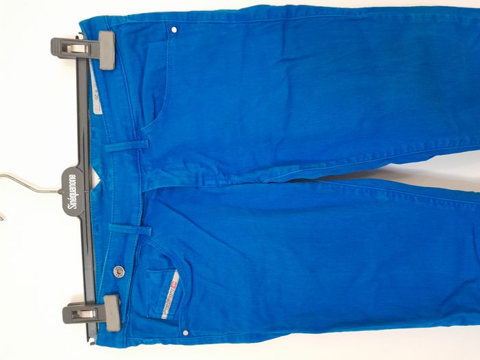 Jean, 5 poche, attache 1 bouton intérieur, 2 bouton extérieur Longueur : 95cm Taille en cm : 38 Matière : 99 % Coton, 1 % Elasthanne Marque : Diesel