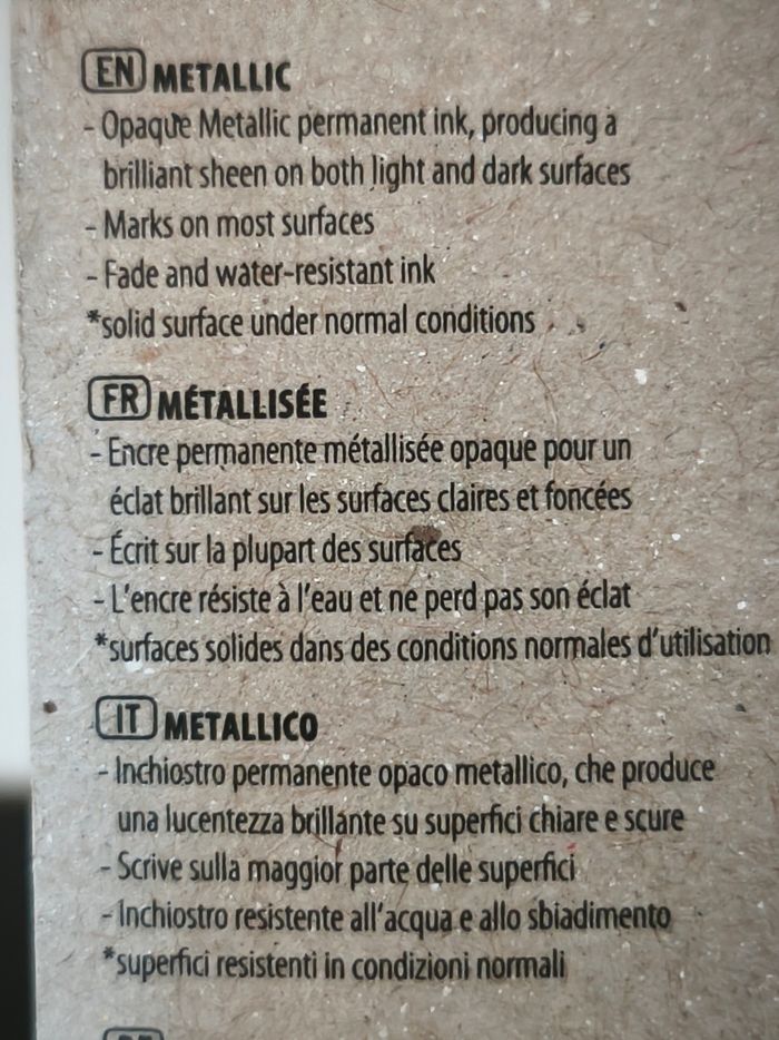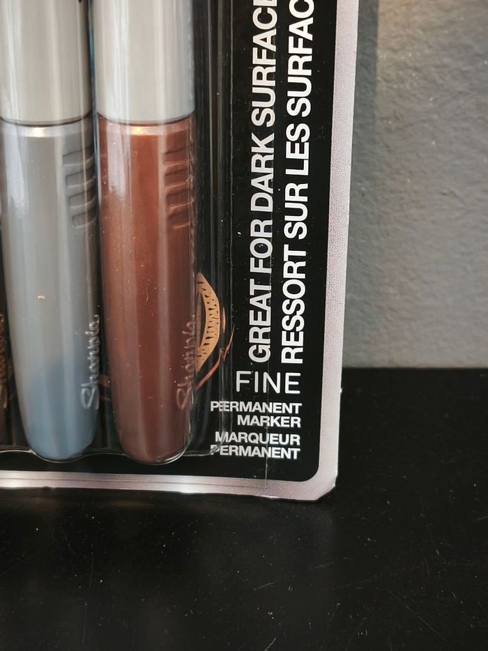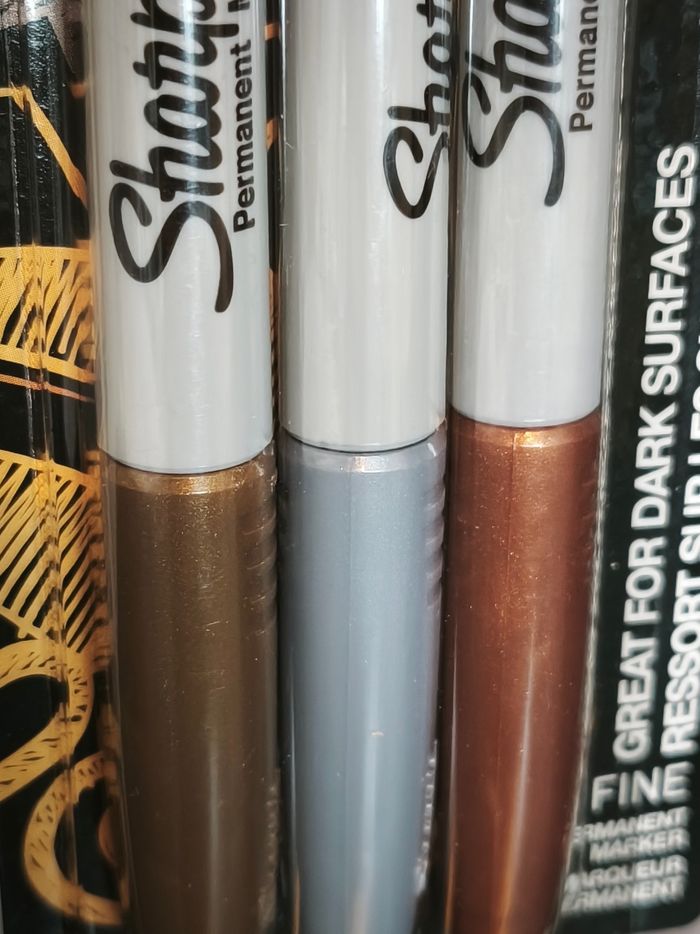 NEUF Marqueurs permanents SHARPIE METALLIC. Conçus spécifiquement pour ressortir sur les surfaces sombres (papier noir, plastique foncé, etc.). Encre Permanente, opaque, résistante à l'eau et à la décoloration. ​Pointe Fine (standard pour l'écriture et le dessin précis).