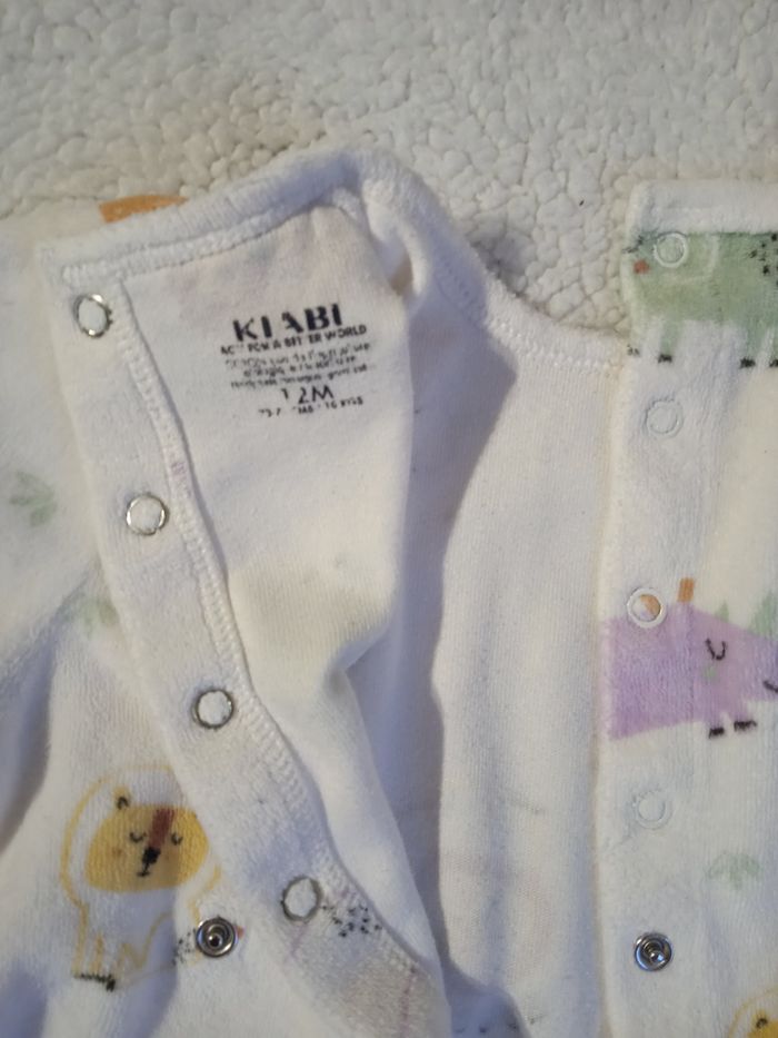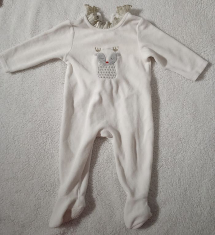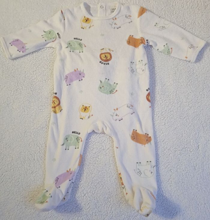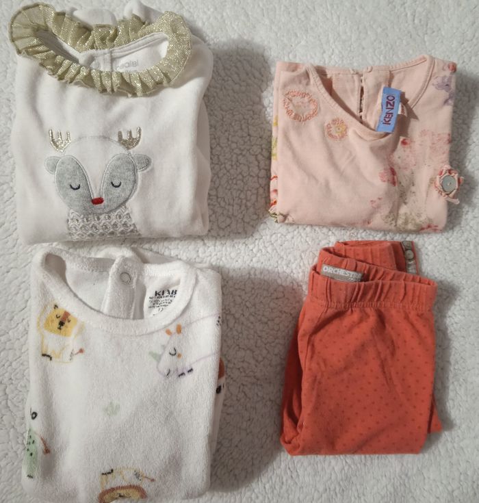 Pyjama grenouillère blanc avec des animaux multicolores.Mixte.La marque est Kiabi.Pyjama grenouillère blanc avec une jolie tête de cerf brodé.Mixte.La marque est OBAÏBI.Legging fushia de marque Orchestra.Joli haut tout doux fleurie de marque Kenzo