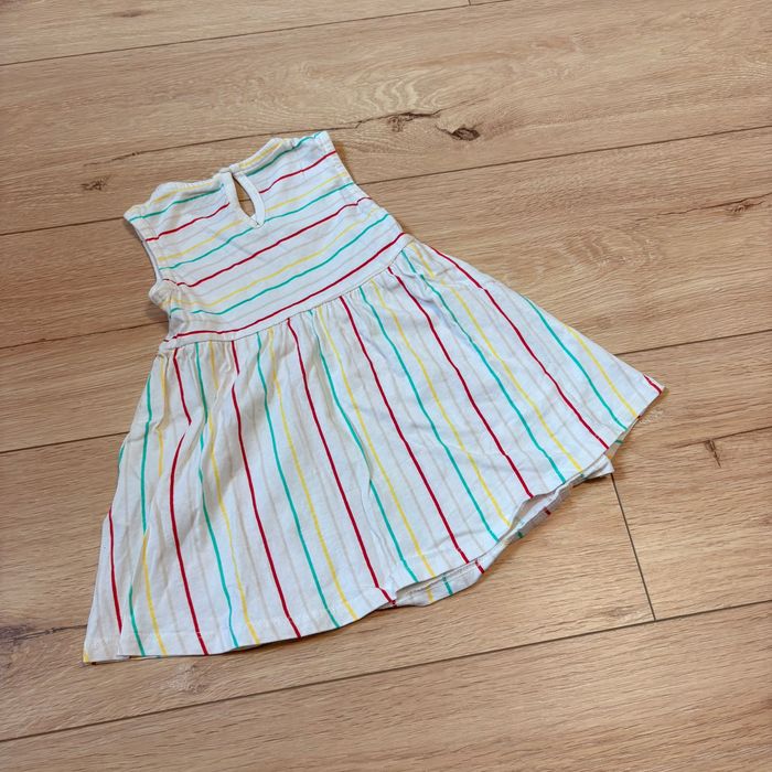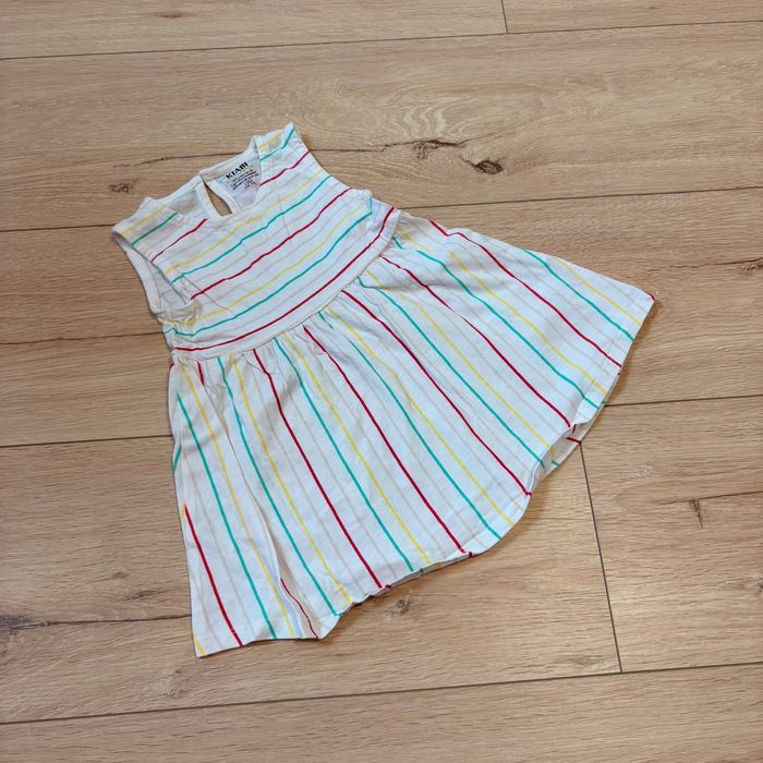 Jolie robe Kiabi taille 12 mois, fond blanc avec rayures multicolores (rouge, jaune, vert) 🌈 Sans manches, légère et agréable à porter, parfaite pour l’été Un joli tombé, fermeture bouton au dos. Très bon état, peu portée.