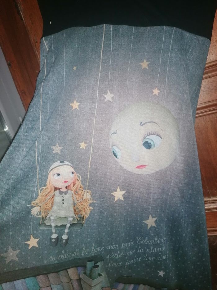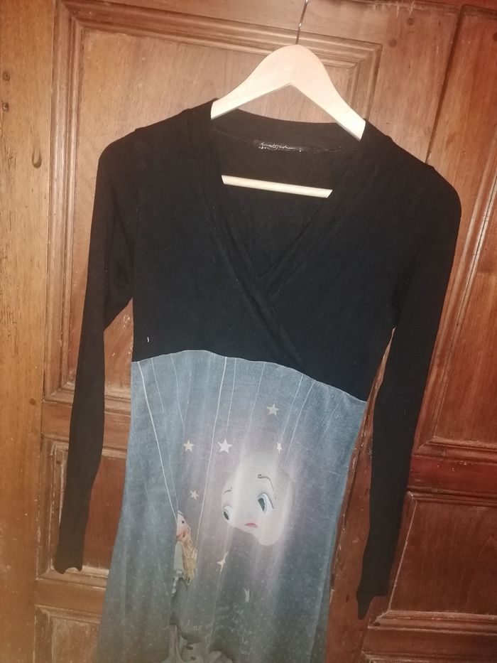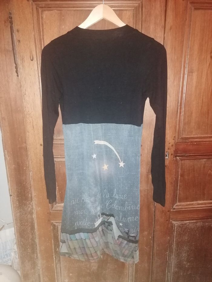 Robe Pierrot Colombine M Très belle robe, haut moulant style juste au corps danseuse, très stretch. Jupe ample, gris bleu motifs lune, Colombine super sympa. Doublée d'un jupon noir stretch. Arrive sous le genou, voir les dimensions sur les photos. Très facile d'entretien. Très peu portée. Haut près du corps, jupe mi-longue. Malheureusement trop petite pour moi. Très stretch, elle s'ajuste au corps. Achetée neuve 29 € dans un petit magasin indépendant. Avec des bottes noires et un collant noir opaque, elle est super originale, féminine et décontractée en même temps. Look vintage, je m'en sépare avec regret. Âme d'enfance et poète... Faites un lot, 10% de remise dès 5 articles achetés 💙🖤💙!!