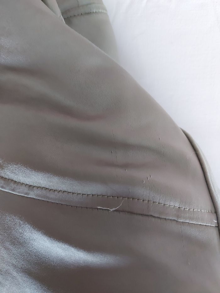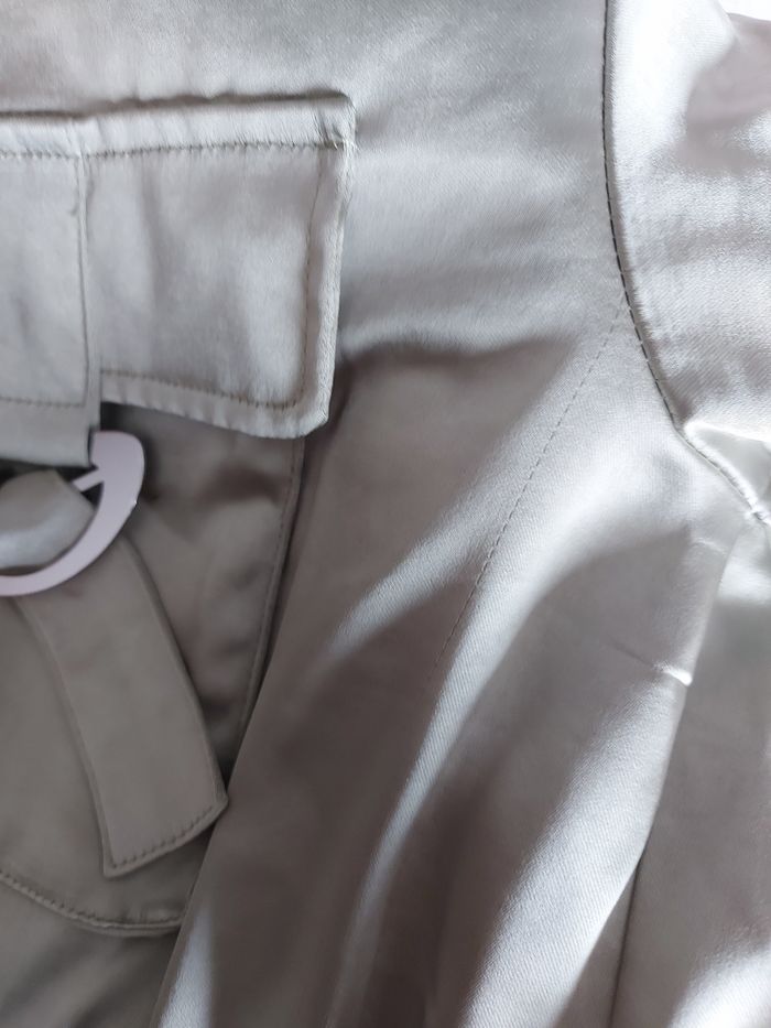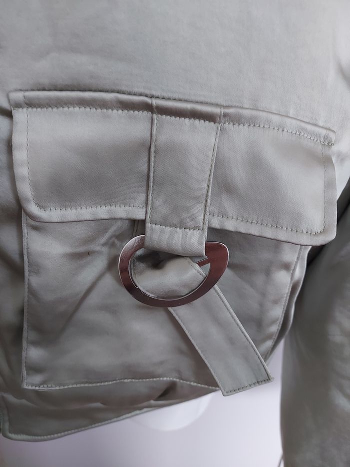 Blouson bomber, kaki, en satin. Couleur plus vive que sur les photos Pimkie Taille L Quelques petites taches suite à l'entreposage mais partiront à la machine. Quelques fils légèrement tirés mais se voit peu Neuf