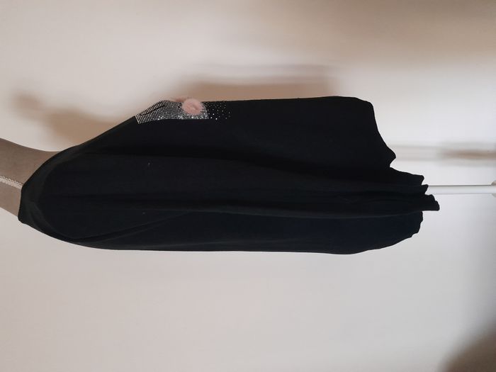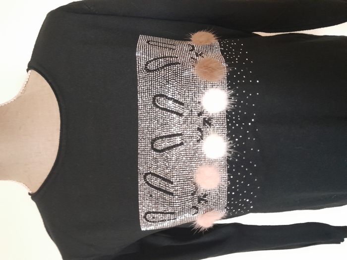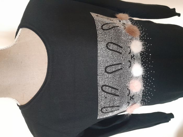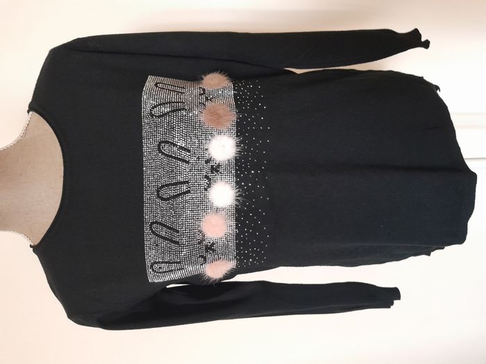 Pull, imprimé de strass et pompon, devant, de forme asymétrique Longueur : 70cm Aiss / Aiss : 51cm Matière : 50 % Viscose, 28 % Polyester, 22 % Nylon Marque : sans étiquette