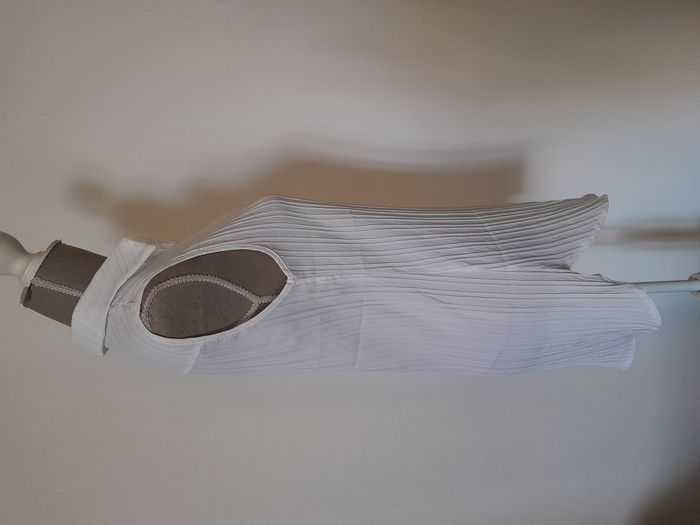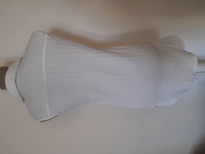Blouse, sans manche, col chemise, de forme asymétrique, arrondie sur le bas Longueur : 79cm Aiss / Aiss : 42cm Matière : 98 % Polyester, 2 % Elasthanne Marque : sans étiquette