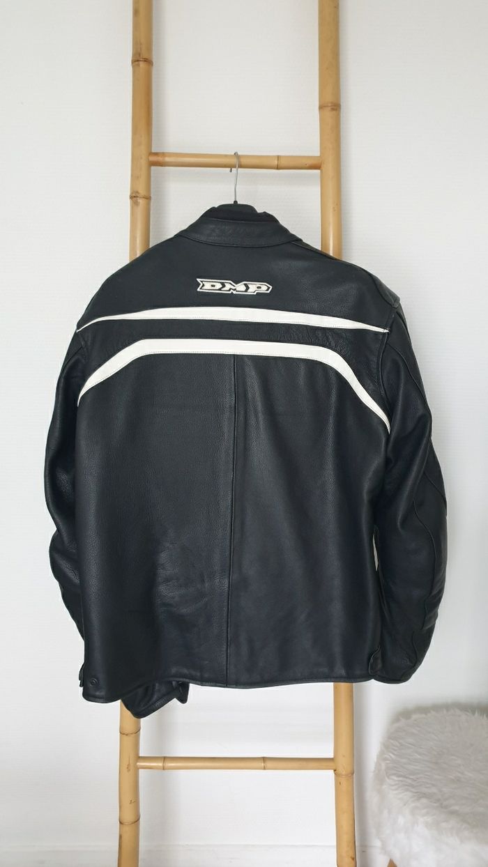Blouson moto en cuir noir et blanc taille XL Quelques traces d usure dues au temps (visible sur les photos) mais rien de méchant. Jamais de chute. Doublure amovible et protections dos, épaules et coudes