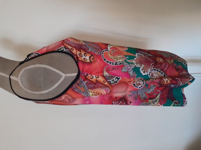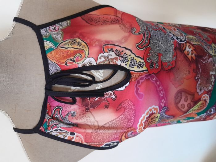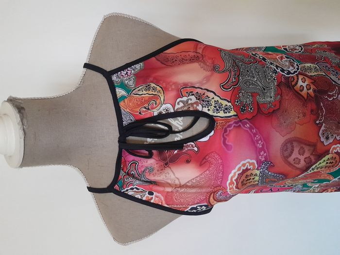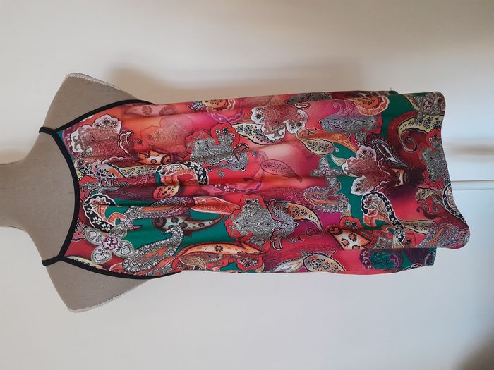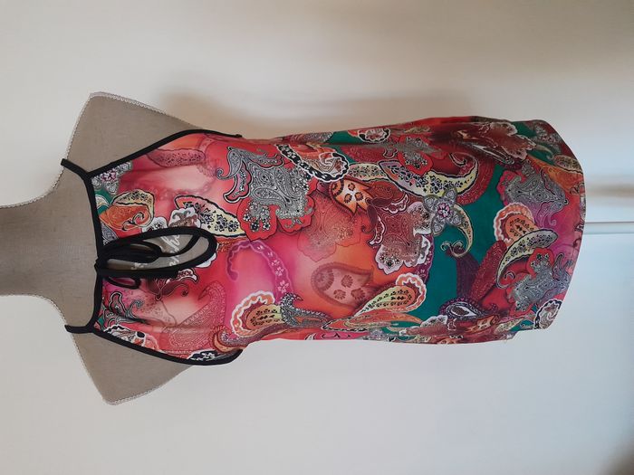 Débardeur, imprimé style année 70, attache cordon devant Longueur : 63cm Aiss / Aiss : 48cm Matière : 100 % Polyester Marque : sans étiquette