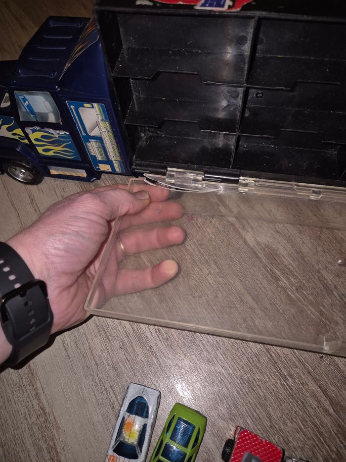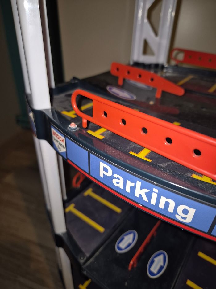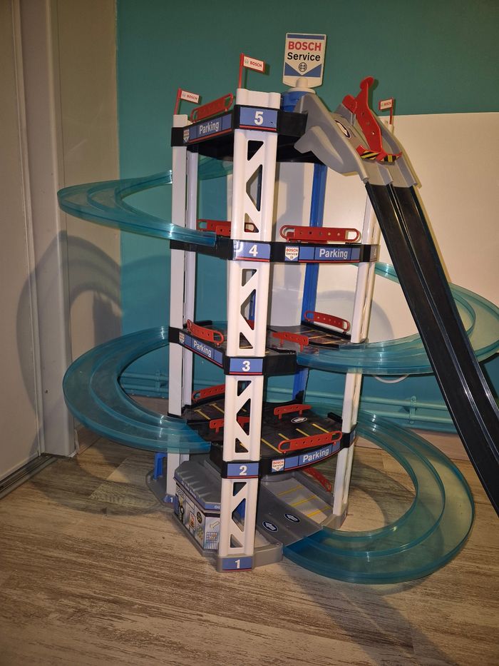 Garage bosch avec rampe de lancement Plusieurs voitures certaine tbe d'autres abîmés Je donne dans le lot le camion transporteur abîmé les porte ne ferme plus