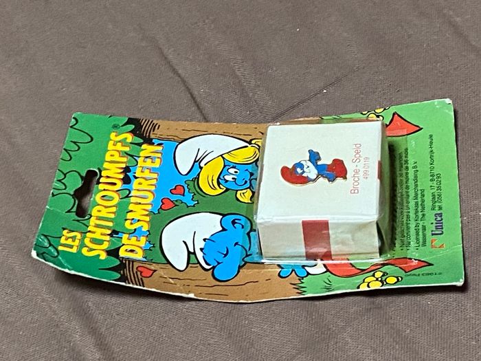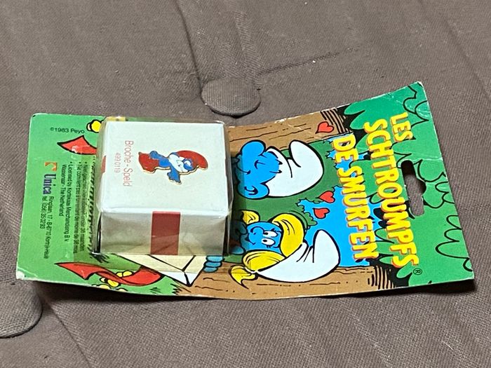 Rare : Broche - Speld Grand Schtroumpf de 1983, neuve. Les Schtroumpfs - De Smurfen - Unica - Bijou Schtroumpf vintage La broche est neuve, mais l'emballage présente des traces de jaunissement et d'usure. Smurf, schlumpfe, pitufos, peyo, 499.0119, puffi, puffo, smurfen