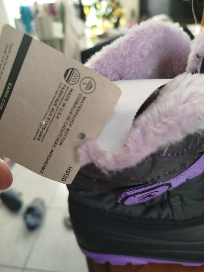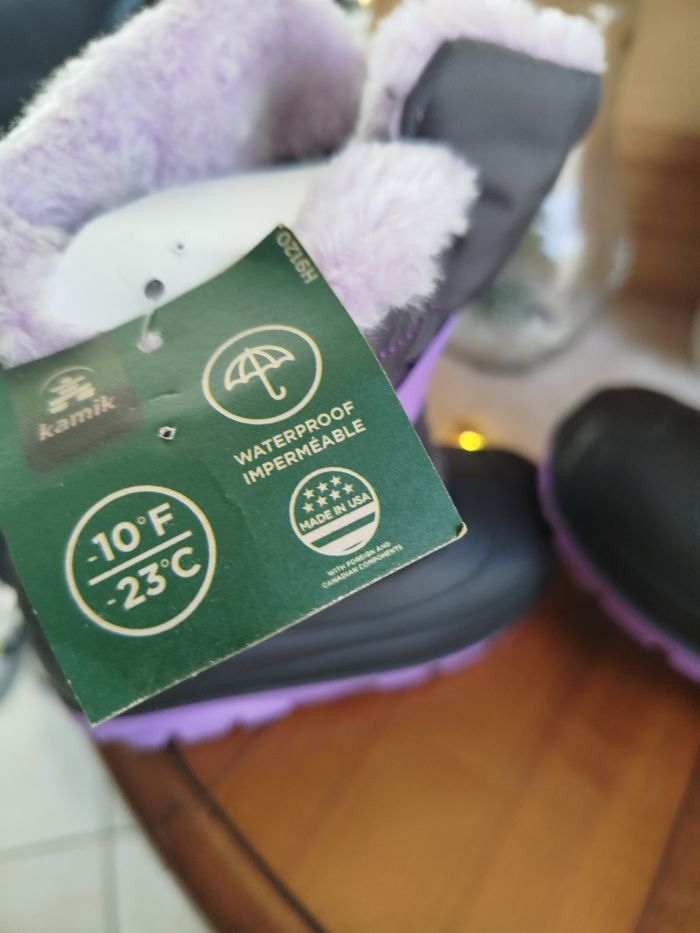 🥾 Bottes d’hiver Kamik – Neuves avec étiquette – Taille 23 EU (US 7) Bottes d’hiver Kamik pour enfant, neuves avec étiquettes, jamais portées. Parfaites pour affronter la neige, le froid et l’humidité. Détails : • Marque : Kamik • Pointure : US 7 enfant • Équivalent : EU 23 • Longueur du pied : environ 14 cm • Température : jusqu’à -23°C • Imperméables (Waterproof) • Couleur : gris, noir et violet • Semelles antidérapantes • Intérieur doublé en fausse fourrure • État : Neuf avec étiquette Idéales pour l’hiver, la garderie, l’école et les sorties dans la neige ❄️