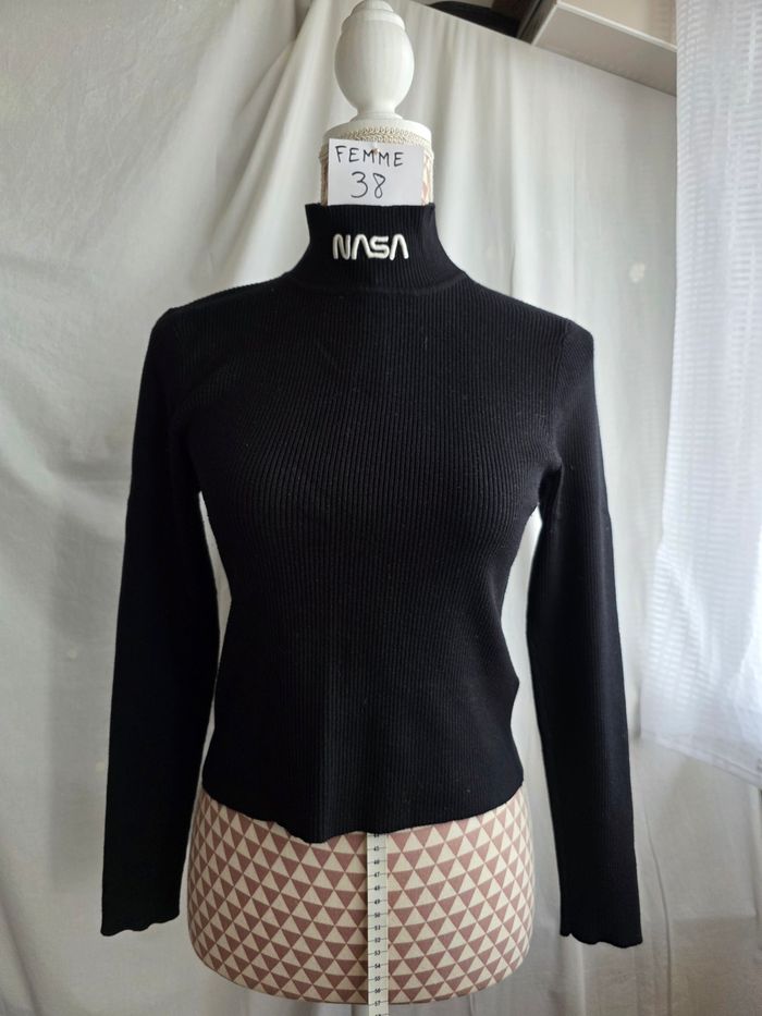 Tee-shirt, noir,col montant, crop top, en très bon état, largeur d'épaule 32cm, largeur sous bras 39cm, longueur 44cm,en acrylique/viscose/ polyamide,marque Nasa/H&M =5€ - photo numéro 1