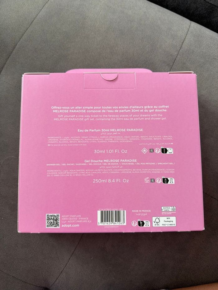 Coffret adopt Comprenant : Une eau de parfum 30 ML Un gel douche 250 ML Neuf jamais ouvert