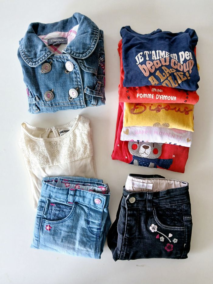 Lot fille 18 mois en tres bon état composé de : - 2 tee-shirts manches longues Gemo - 1 jean Gemo - 2 hauts manches longues In Extenso - 1 jean Orchestra - 1 pull léger Sergent Major - 1 veste en jean Creeks - 1 blouse Creeks #fille18moisgaelreva #maternitépuericulturegael #fille18mois #lotfille18mois