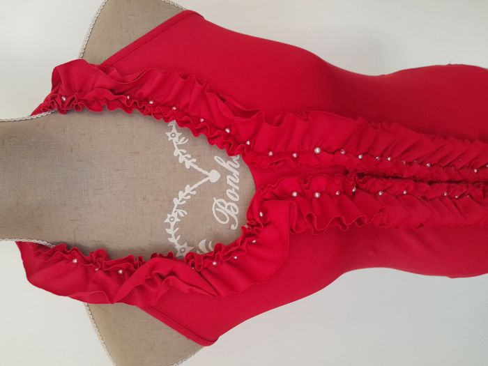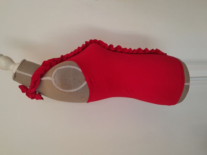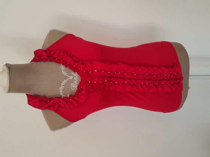 T-shirt, dos nue, avec frou frou et perle devant, attache nœud au cou Longueur : 39cm Aiss / Aiss : 38cm Matière : 95 % Polyester, 5 % Elasthanne Marque : L et C