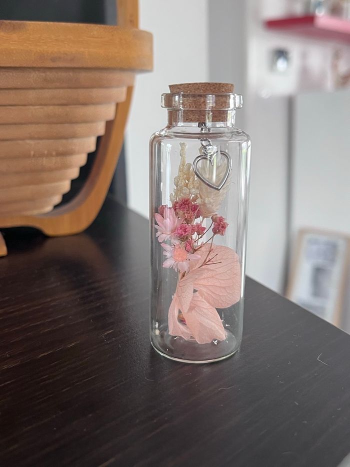 Fiole fleurs séchées Fournie avec ficelle, petit carton et vis. Possibilité d’en avoir 2. 2€ l’unité.
