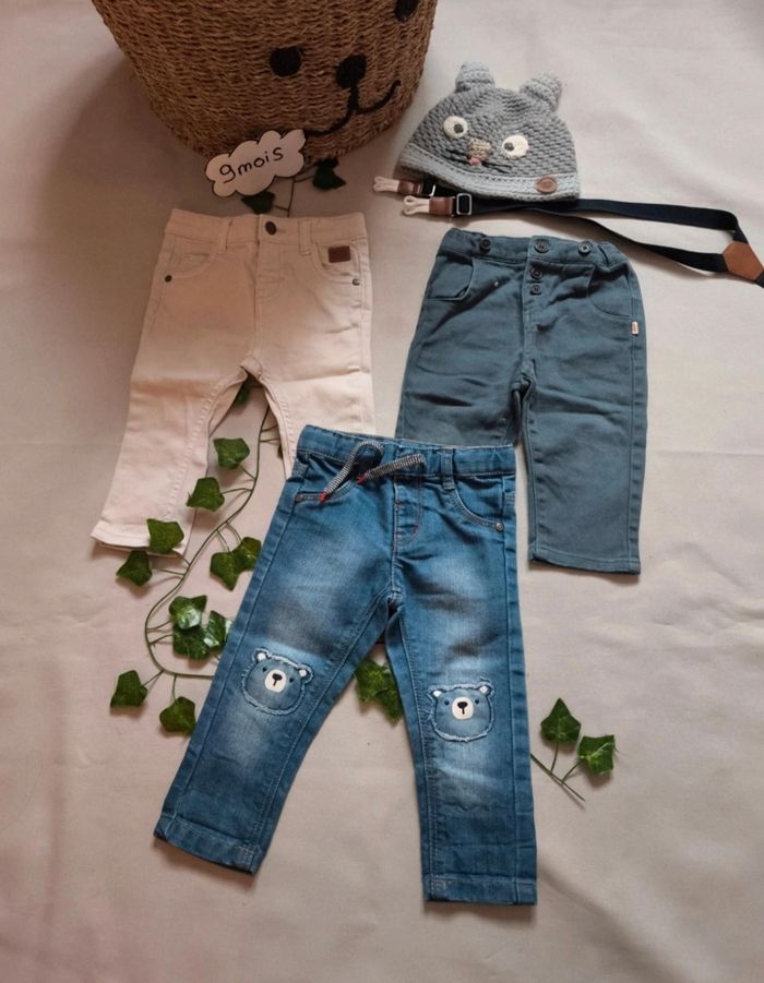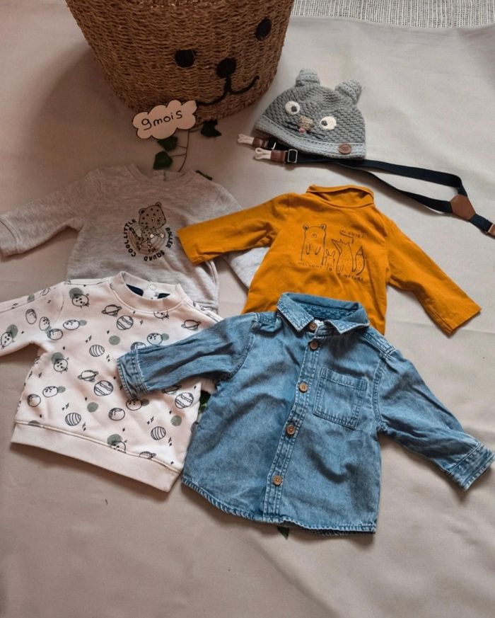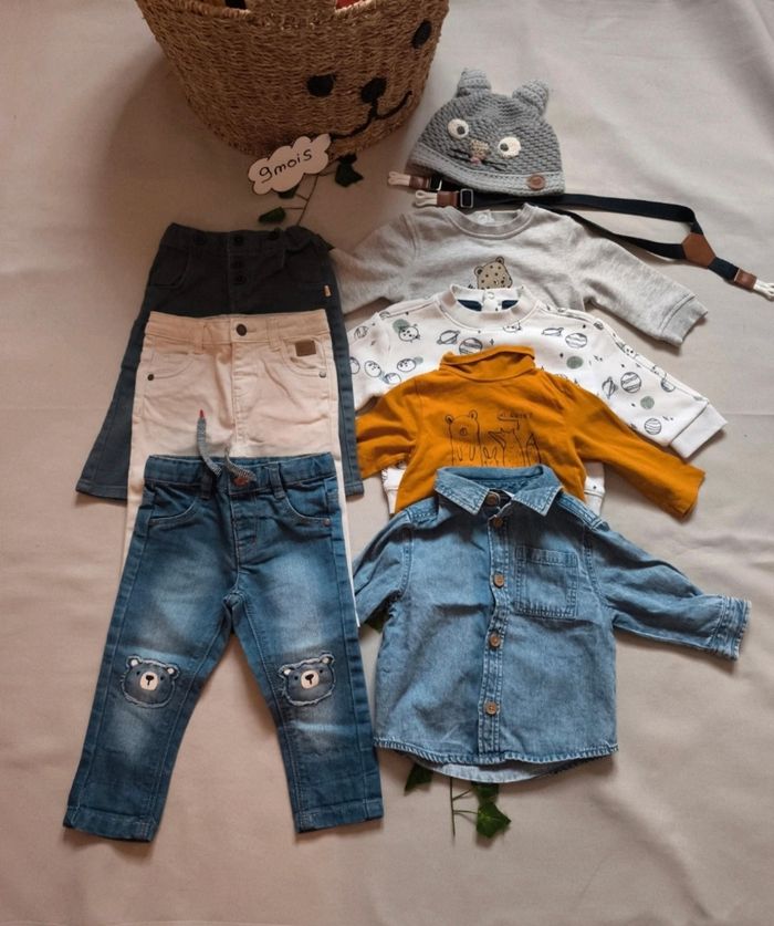 ❌MAISON NON FUMEUR ! ❌VÊTEMENTS DE 1ER MAIN Lot de 9 vĂȘtements hiver mi-saison en trĂšs bon Ă©tat, le lot comprend ‱ 3 pantalons ‱ 2 sweats ‱1 chemise ‱ 1 t-shirt manches longues col roulĂ© ‱ 1 bonnet et des bretelles (voir photos) Taille 9 mois (71cm)