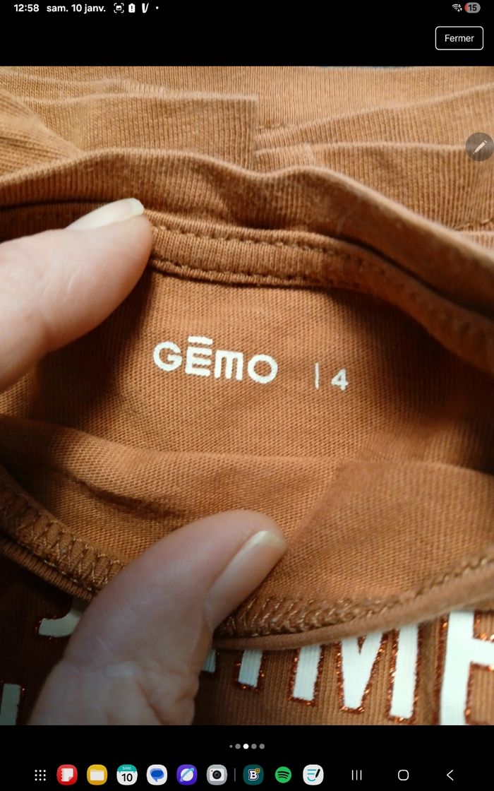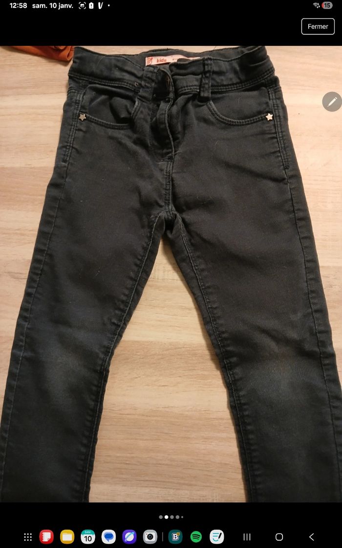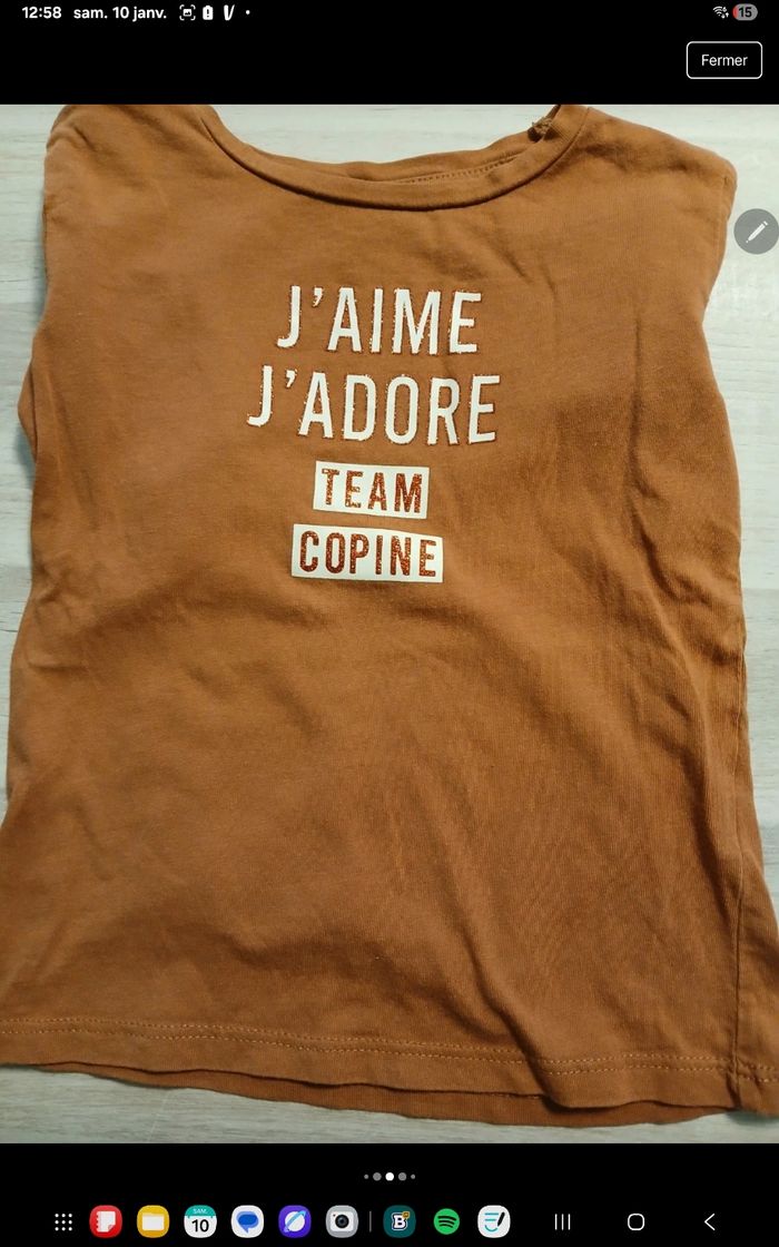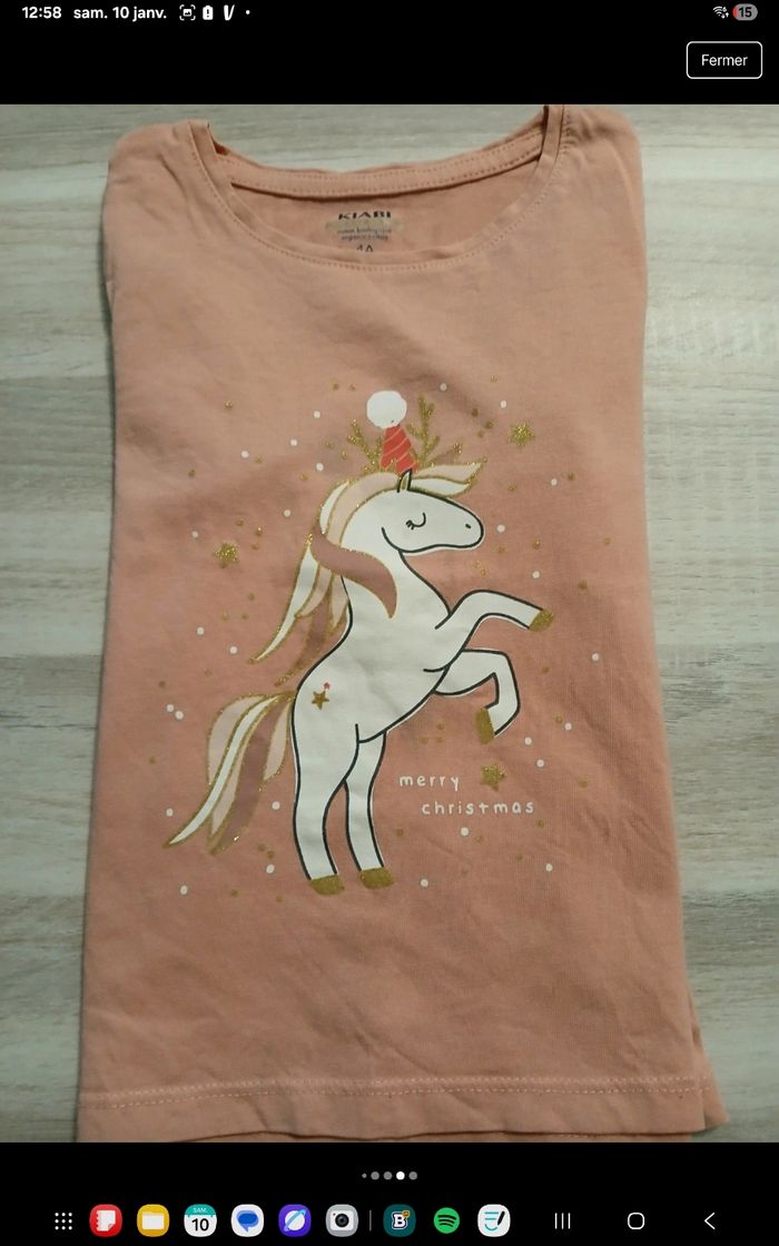 Ensemble 2 Tee-shirt manche longes 1 manches longues gemos moutarde 1 rose corail licorne kiabi quelque ombre au niveau de la licorne mais passe inaperçu pantalon gemo noir bleu petites traces au genoux