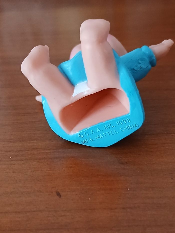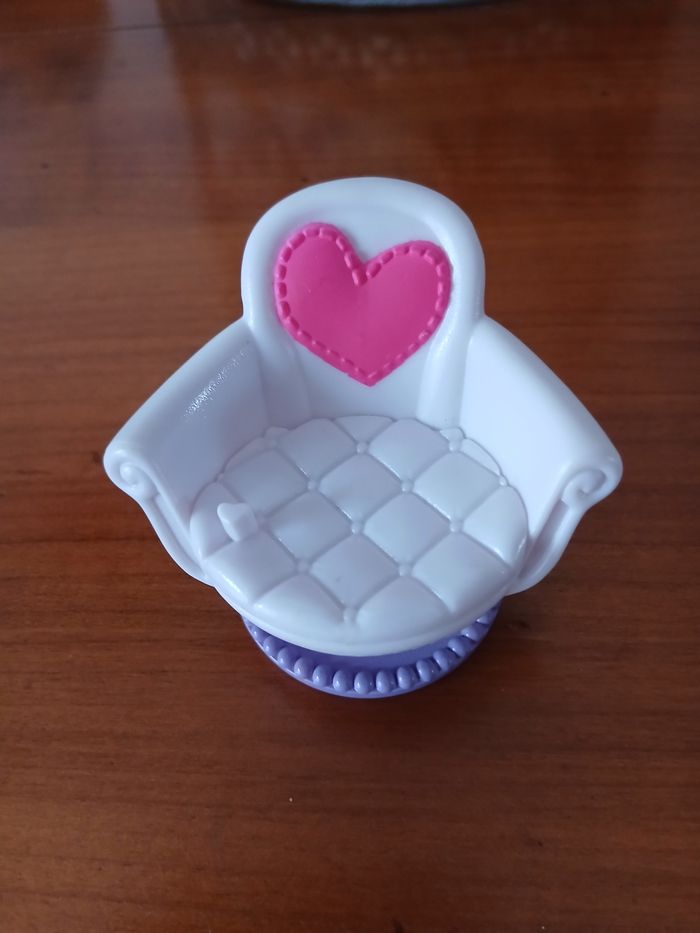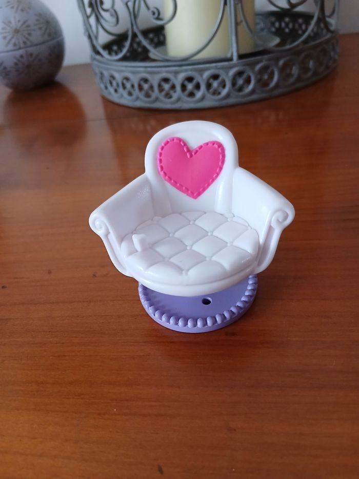 2 figurines pour maison de poupée. Bébé marque Mattel,en position assise; en plastique dur; hauteur de 3 cm + Fauteuil pivotant, sans marque; en plastique dur. Hauteur de 4 cm // voir photos pour détails