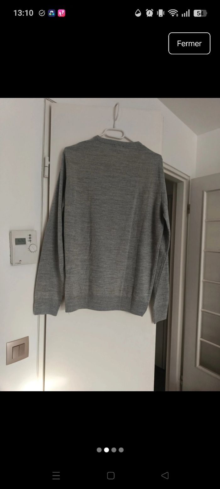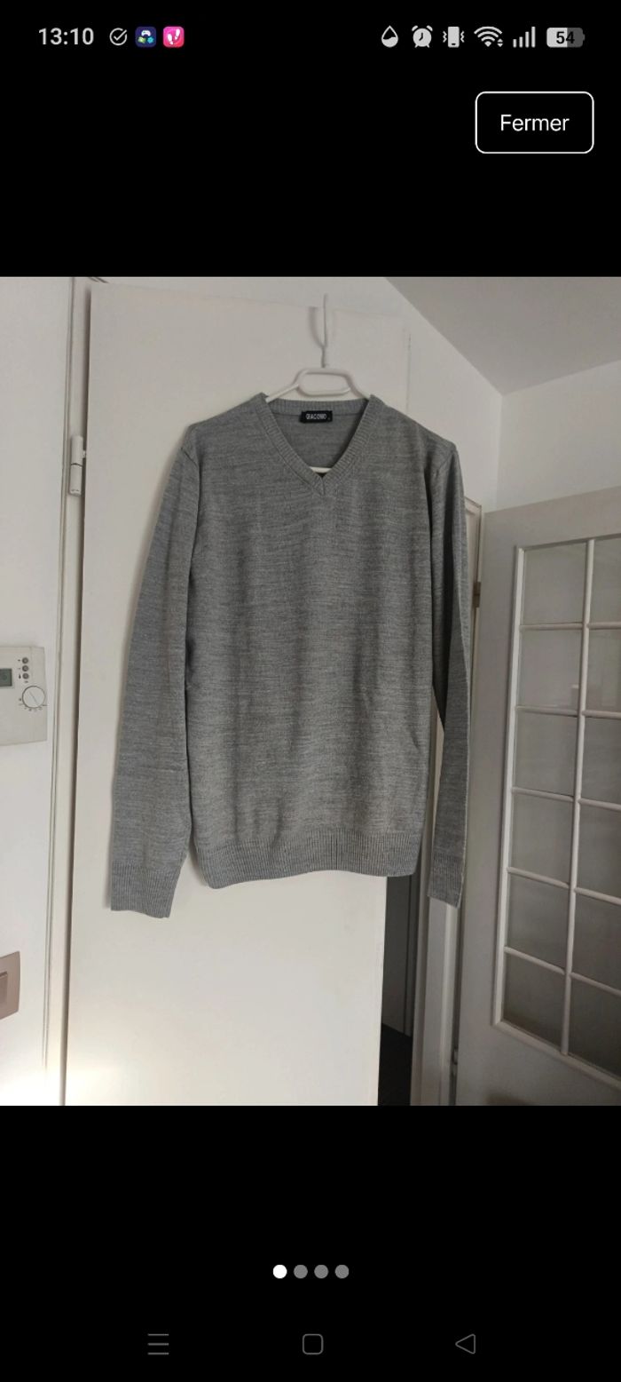 Pull col en V, gris, 70 % laine. Il est fin mais chaud, peut se porter sur une chemise.