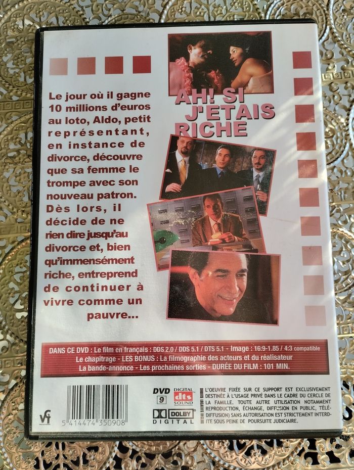 Je vends le film "Ah ! Si j'étais riche" en DVD, une comédie française avec Jean-Pierre Darroussin et Valéria Bruni-Tedeschi. - Type de produit : DVD - Titre : Ah ! Si j'étais riche - Réalisateur : Michel Munz et Gérard Bitton - Acteurs principaux : Jean-Pierre Darroussin, Valéria Bruni-Tedeschi, Gérard Berry, François Morel, Zinedine Soualem Le DVD est en bon état. N'hésitez pas à me contacter pour plus d'informations !
