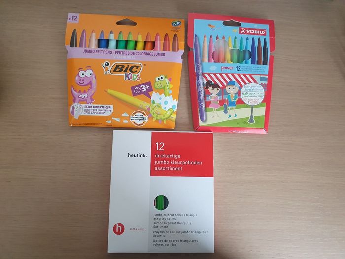 A vendre lot de feutres et crayons de couleur pour coloriage. Idéal enfants de 2-4 ans. Feutres et crayons de couleur beaucoup utilisés en classe de Petite section ! Ce lot comprend : - 12 feutres Bic Visacolor XL, grosse pointe, neuf sous scellé. - 12 feutres bic pointe médium, neuf sous scellé. - 12 crayons de couleur jumbo triangulaire, marque heutink. Neuf ! N'hésitez pas à jeter un coup d'œil sur mon dressing. Une réduction dès 2 articles achetés !