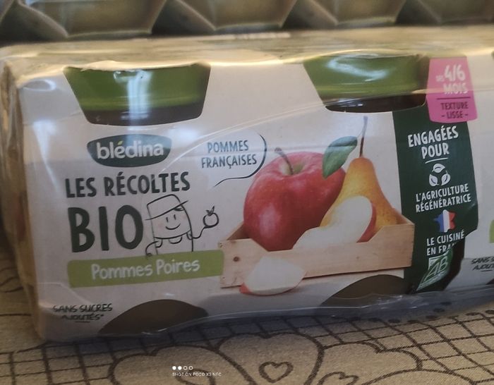 Pots Bledina Bio enfants Par lots de 2 pots Pommes poires. 4/6 mois Date de péremption 08/07/2026 J ai plusieurs petites pots pommes poires