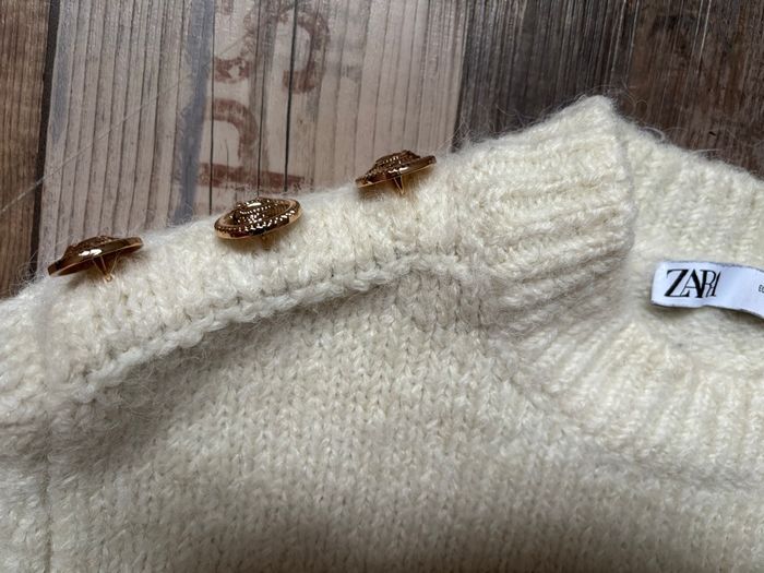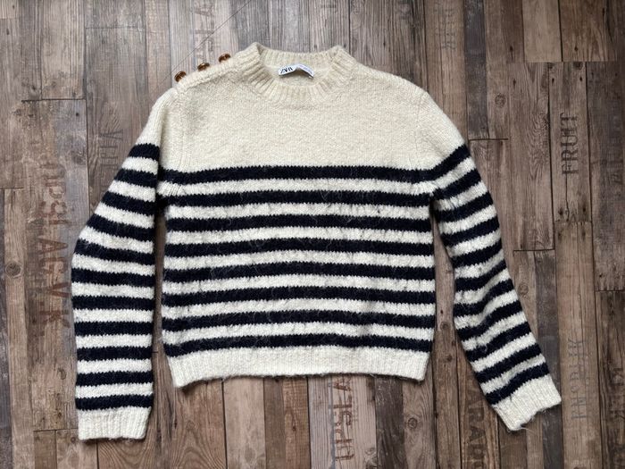 Pull en maille marinière Zara Couleurs : blanc et rayures bleu marine avec boutons dorés sur l’épaule Taille L mais ce modèle taille petit et convient donc très bien à une taille 38 (ma taille) En très bon état N’hésitez pas si vous avez des questions 😉😊