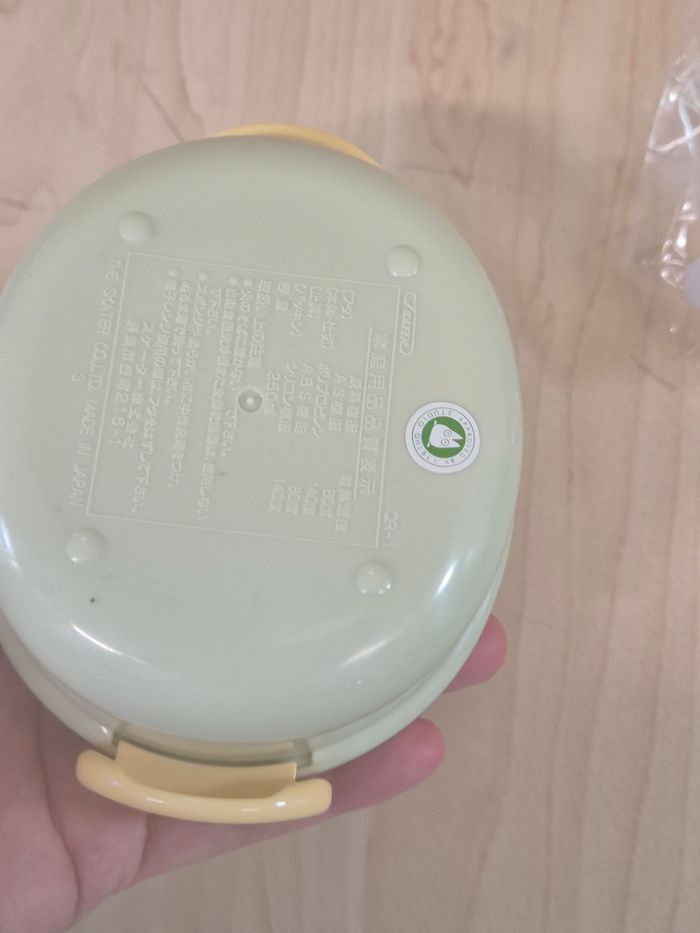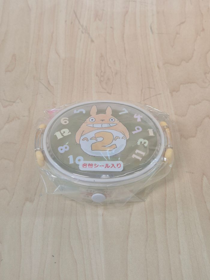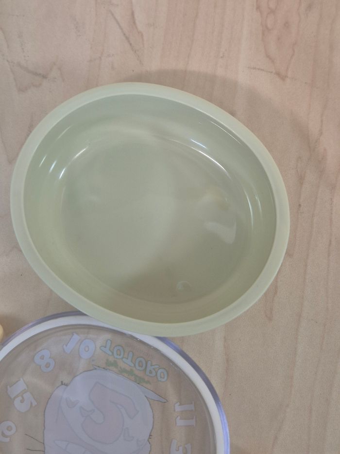 Mini boîte à repas (Lunch box) Ghibli Tonari no Totoro. Plastique, environ 9 cm de large pour 5.5 cm de haut (260 ml de contenance). En excellent état dans son plastique d'origine en état moyen.