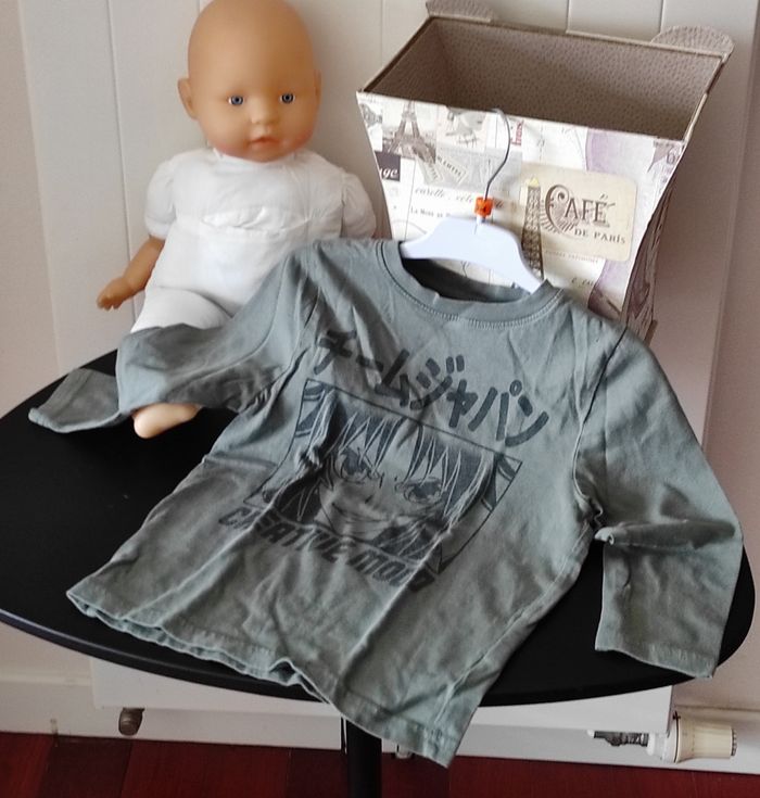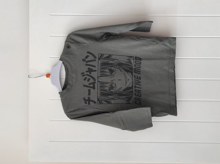 "T-shirt manches longues pour garçon, taille 4 ans. Coloris kaki et noir avec motif personnage manga et texte, style moderne et sympa 👕 ⚠️ À noter (transparence Vinted) : Lors de l’achat, une étiquette a provoqué un petit trou au niveau de l’épaule gauche. 👉 Un bouton décoratif a été cousu pour masquer la réparation. 👉 Réparation propre et discrète, n’altère pas le port du vêtement. ✔ T-shirt propre ✔ Très bon état général ✔ Confortable et agréable à porter Idéal pour un look décontracté au quotidien."