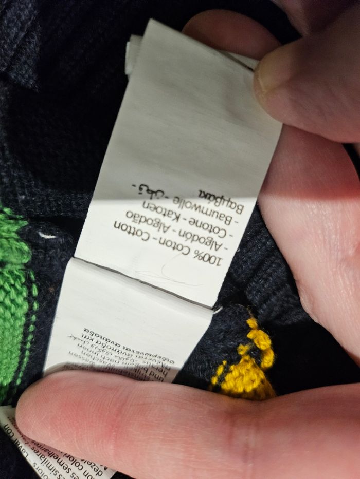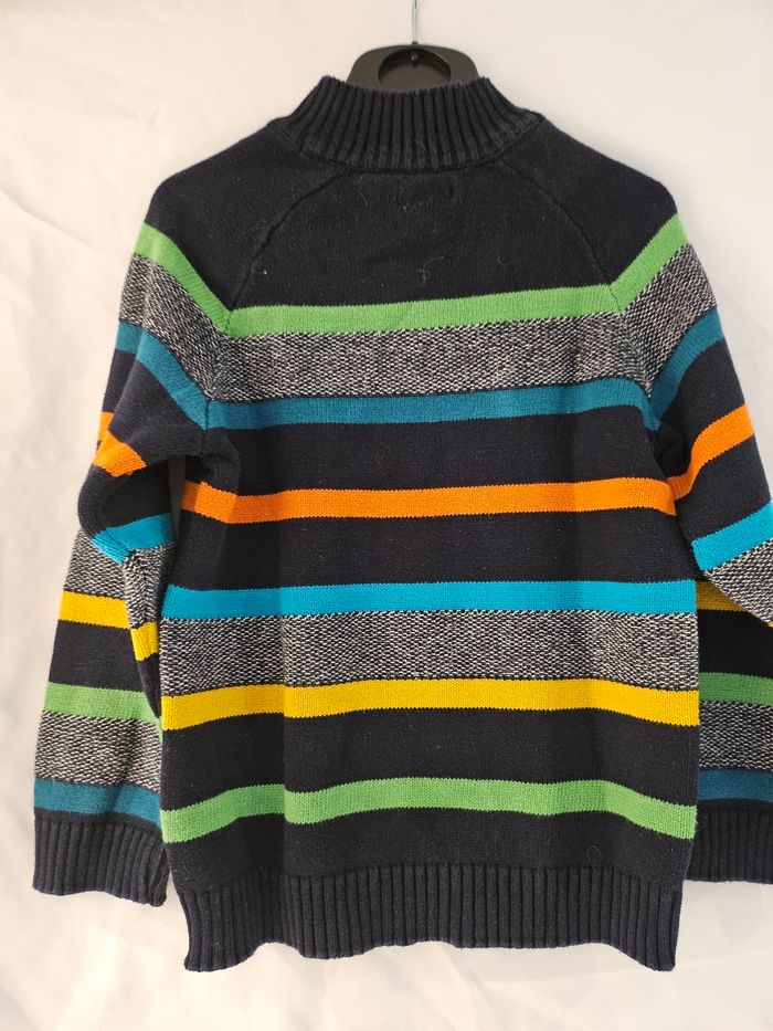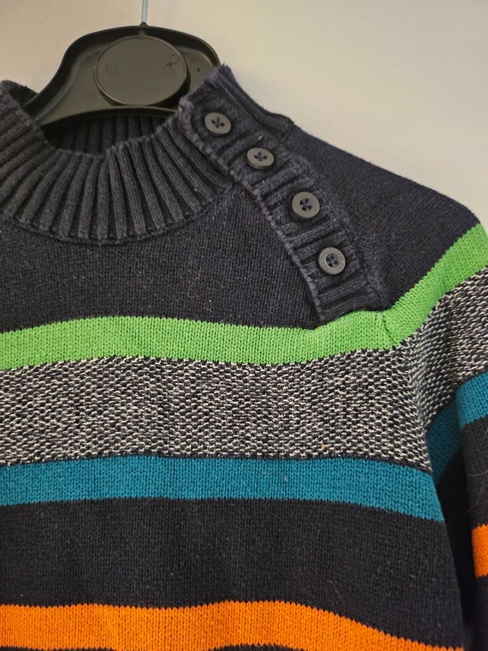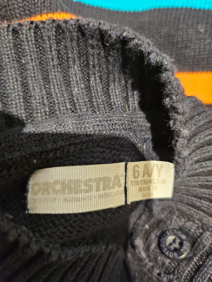 Pull manches longues col haut. 4 boutons au niveau du col. Bleu marine majoritairement et rayures de différentes couleurs. Marque : Orchestra Taille : 6 ans