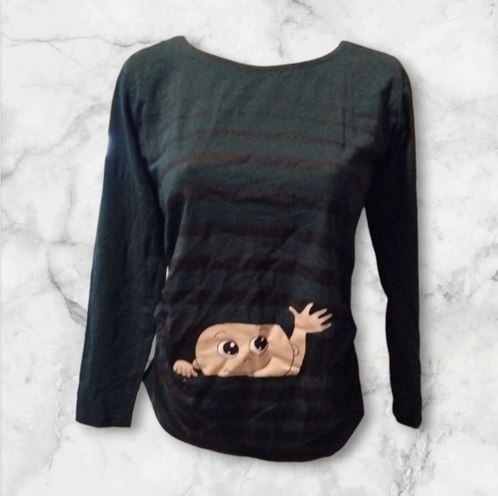 Pull de maternité à rayure, détail bébé qui fais coucou en taille M.