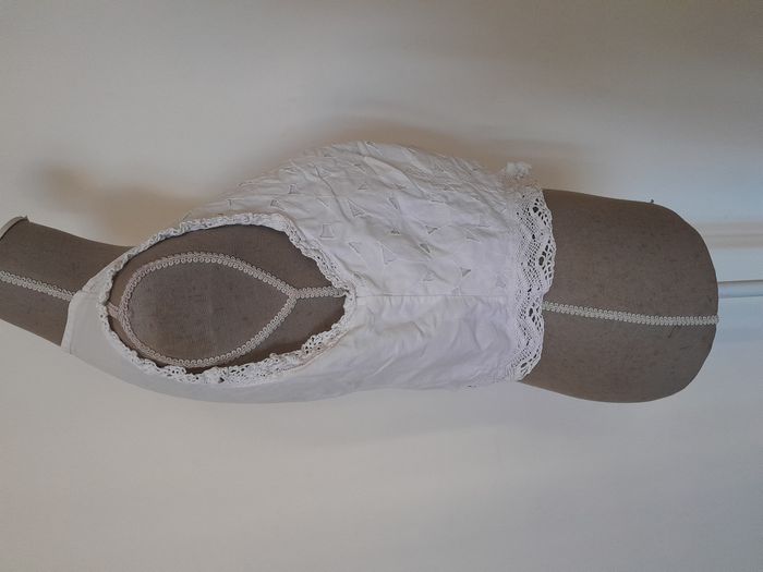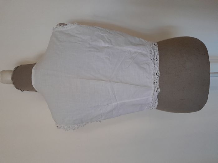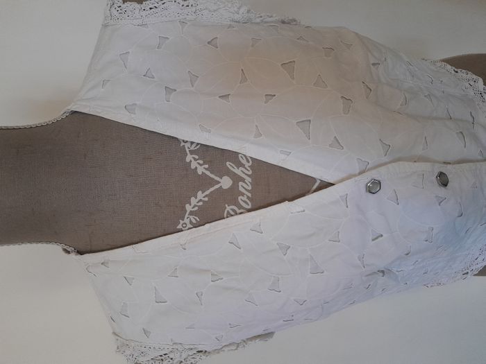 Gilet, sans manche, dentelle au niveaux des bras et du bas, ajouré, doublé, attache bouton pression devant Longueur : 43cm Aiss / Aiss : 48cm Matière : 100 % Coton Marque : Biguine