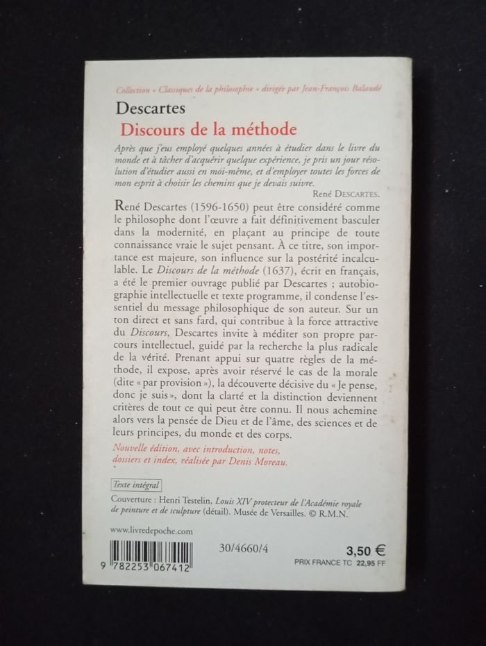 Je vends ce livre "Discours de la méthode" de Descartes, édition de poche. - Titre : Discours de la méthode - Auteur : Descartes - Éditeur : Le Livre de Poche - Année d'édition : Nouvelle édition - Format : Poche Bon état N'hésitez pas à me contacter pour plus d'informations !