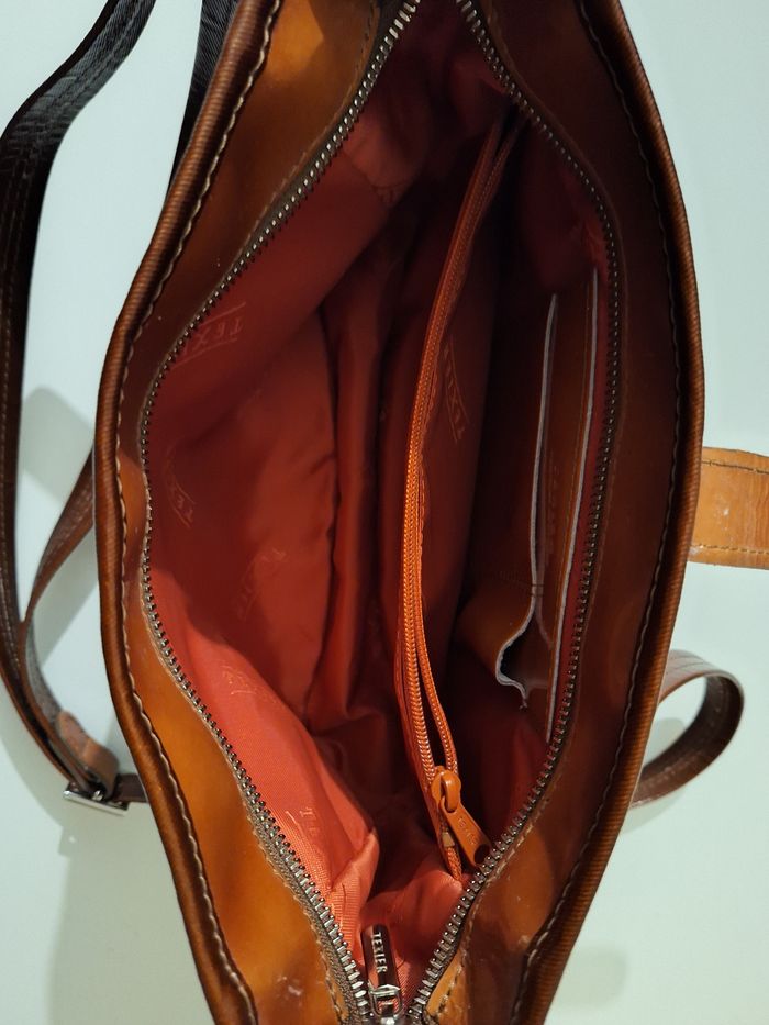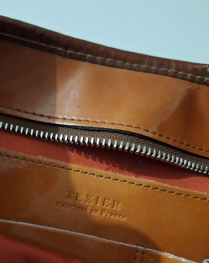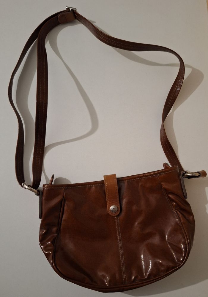 Sac fermé par fermeture et éclair et bouton pression. La bandoulière est réglable. Il est en excellent état. Marron brillant. Largeur 26 cm. Hauteur 20 cm. Un compartiment zippé à l'intérieur. Une poche zippée à l'extérieur. Fabriqué en France.