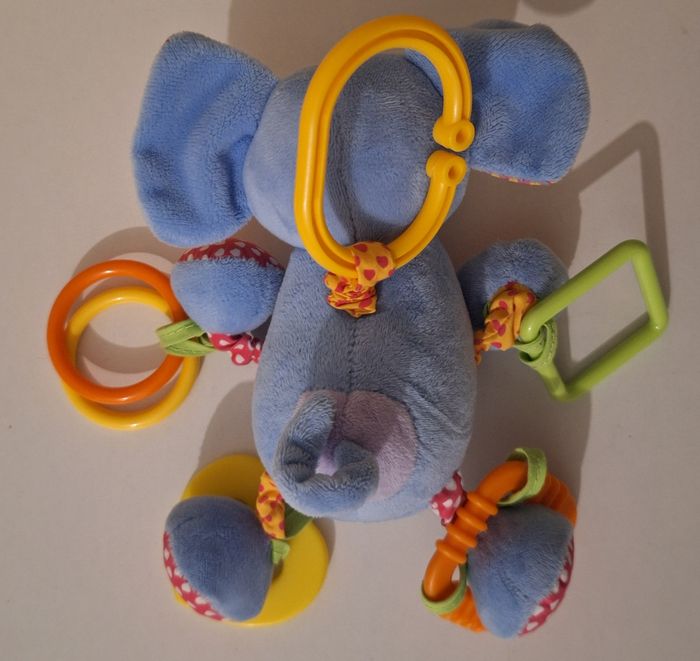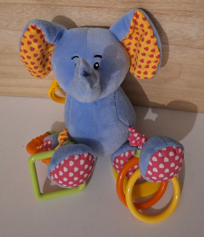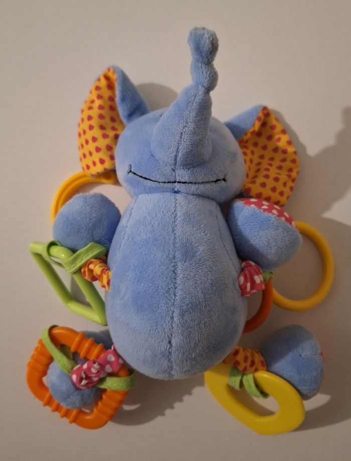 Eléphant bleu tout doux de 20 cm de hauteur avec différents hochets à ses 4 pattes et un crochet de suspension à son dos.