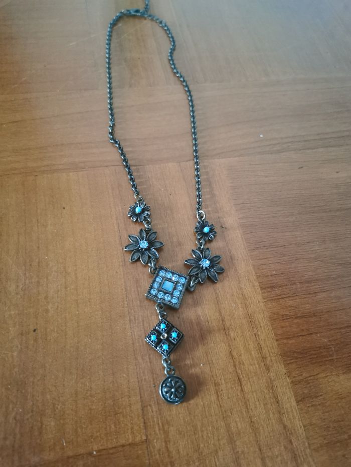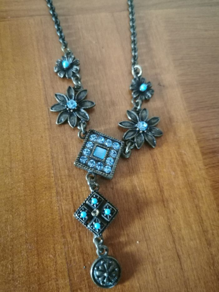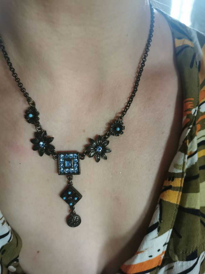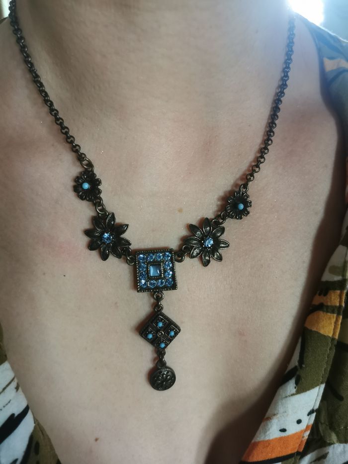 Collier en chaîne maille forçat et fleurs à strass bleus. Très joli collier de couleur bronze et bleu avec des délicats strass et perles bleus, en très bon état. Dimensions : Longueur totale : 50 cm Longueur du pendent : 6 cm Taille de fleur : 2 cm Poids : 25g