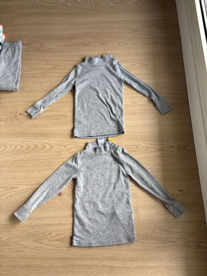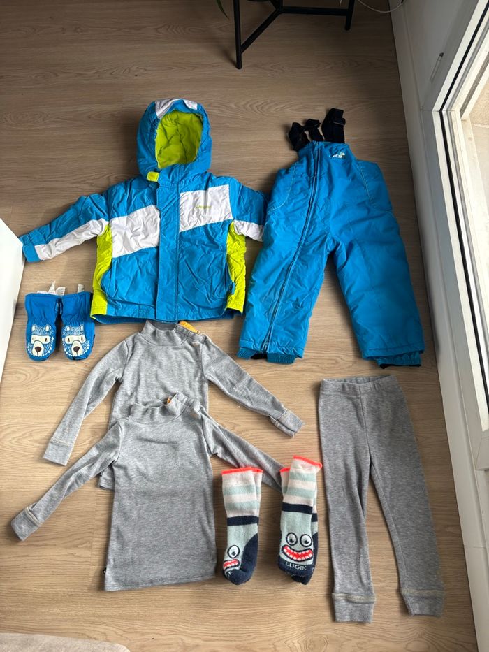 Ensemble ski garçon 2-3 ans composé de : - une veste wed’ze 2 ans 83/90 cm - une salopette 2 ans wed’ze 83-90 cm - 2 tee shirts et un pantalon gris decathlon 24 mois - 3 ans 82-95 cm - une paire de gants 18-24 mois - 2 paires de chaussettes chaudes 23-26