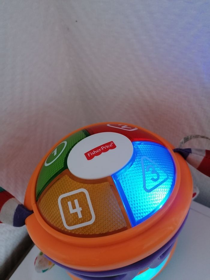 Il dispose de deux modes de jeu : - Danse en musique et lumières : en le faisant bouger. - Apprentissages (chiffres, formes, couleurs) : en appuyant sur 1 des 4 bouton sur le dessus de sa tête. Il permettra de développer la motricité et l'écoute. Pour des enfants de 6 à 18 mois Le volume est réglable.