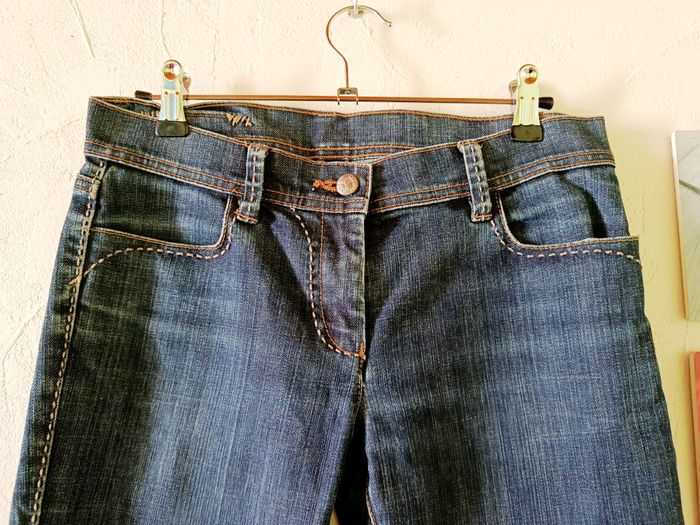 Joli jean taille basse, bouton + fermeture éclair. Très bon état. Largeur à plat à la taille : 37 cm, longueur à partir de l'entrejambe : 77cm. Longueur totale : 96cm. 98% coton et 2% lycra #frip_femme36