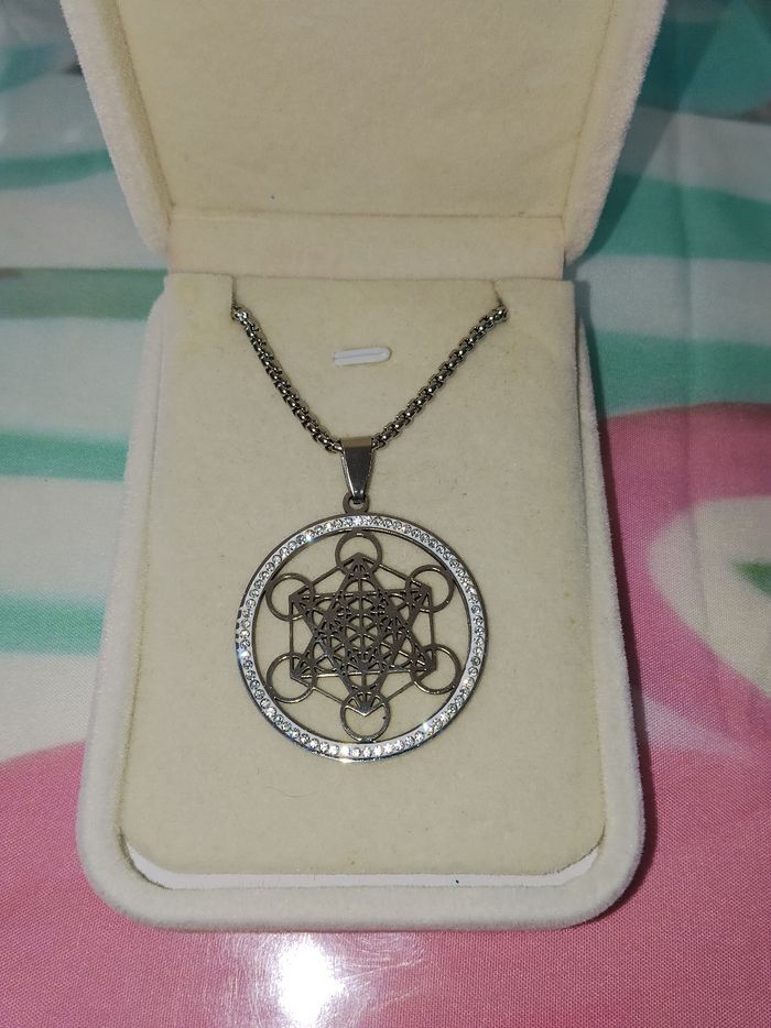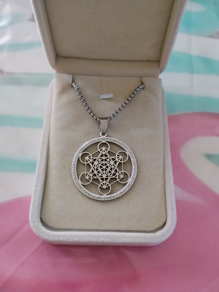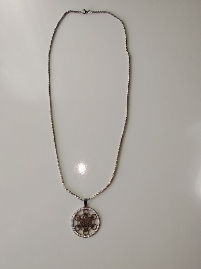 Vends un collier argenté en acier cube de metatron neuf, long 60cm, je vends aussi d autres articles pensez à faire un lot pour activer la réduction et économiser sur les fdp