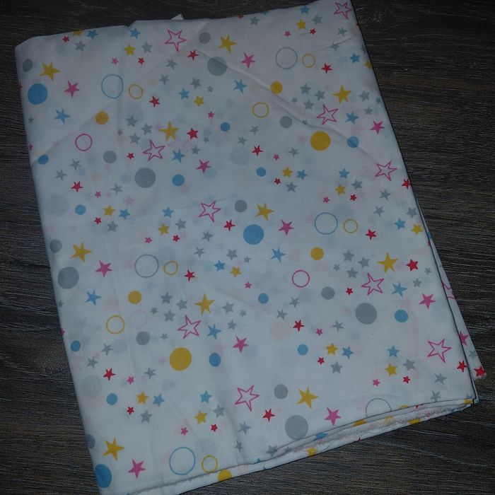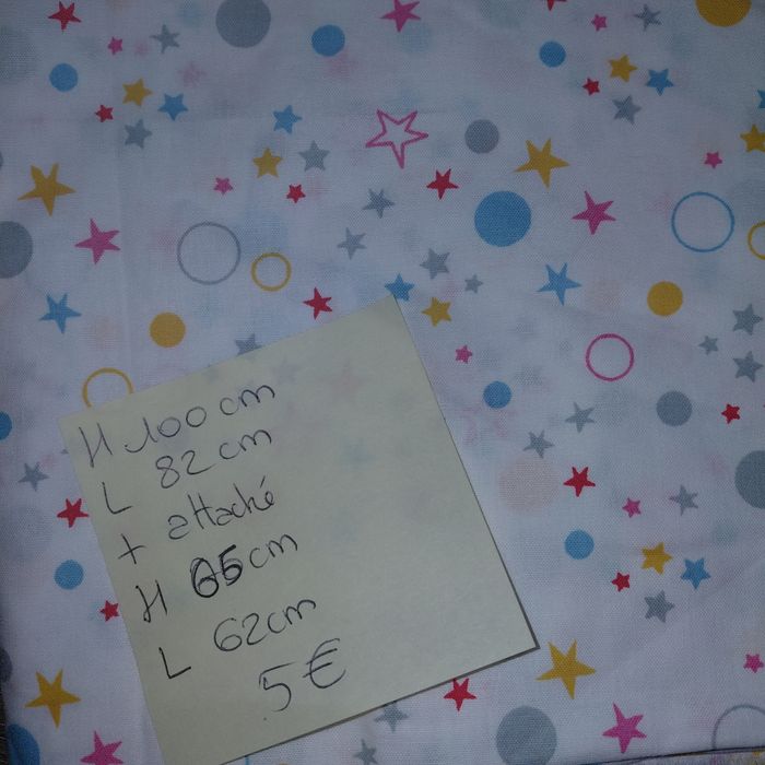 Coupon de coton blanc motifs étoiles multicolores Dimensions hauteur 100 cm largeur 82 cm + attaché hauteur 65 cm largeur 62 cm Tres bon état, jamais lavé
