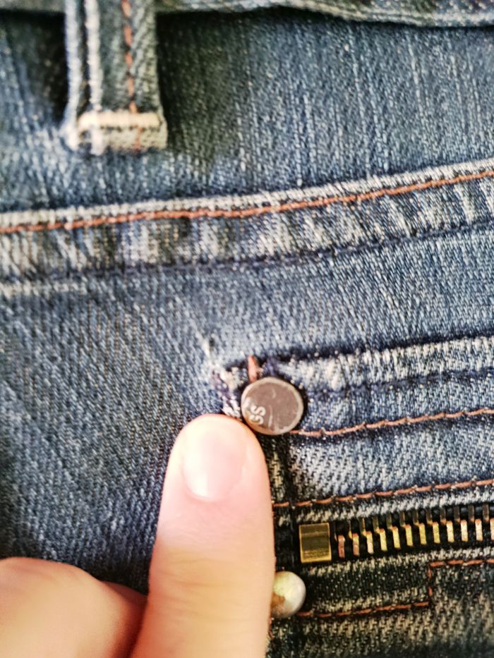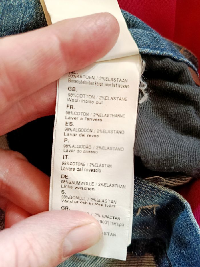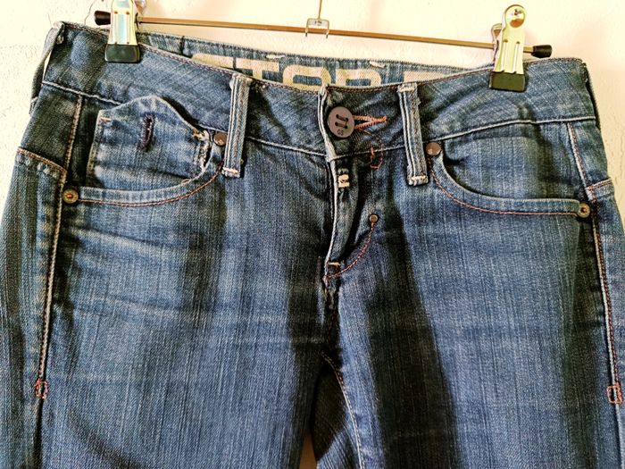 Joli jean taille basse, bouton + fermeture éclair. Très bon état malgré un point d'usure à un angle d'une poche arrière (voir photo). Largeur à plat à la taille : 36 cm, longueur à partir de l'entrejambe : 71cm. Longueur totale : 88cm. #frip_femme36