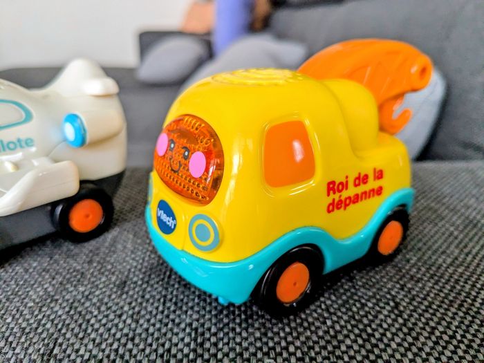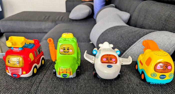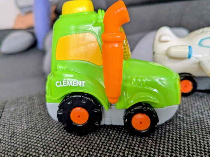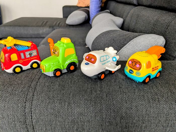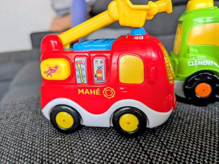 4 tut tut bolides en excellent état avec piles incluses : Yann le roi de la dépanne Eliott le super pilote Clément le tracteur des champs Mahé le camion pompiers Zéro défaut, fonctionnent tous (sons et lumière) Achat du lot uniquement Envoi rapide et soigné