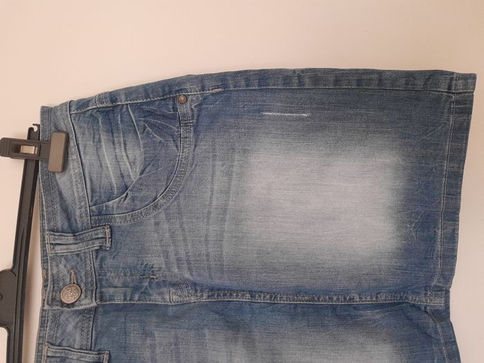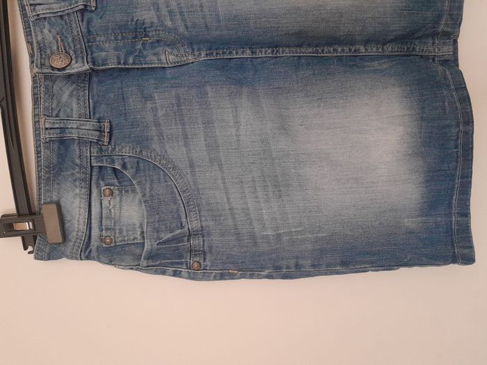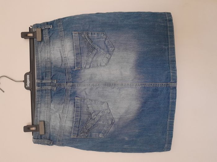 Jupe en jean, 5 poche avec strass sur les poche arrière Longueur : 45cm Taille en cm : 39 Matière : 99 % Coton, 1 % Elasthanne Marque : C et A