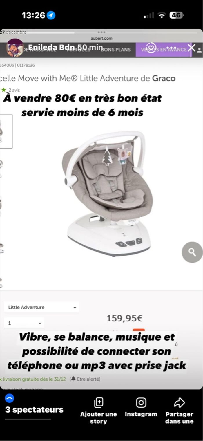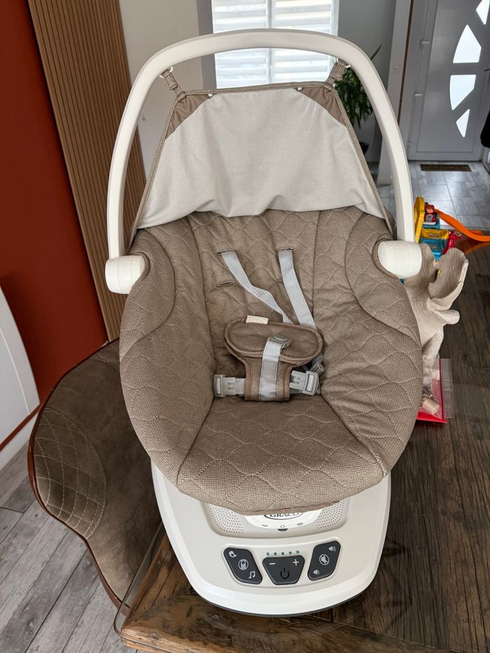 Move with Me reproduit les mouvements apaisants des parents grâce à des mouvements latéraux doux et relaxants à 5 vitesses et 2 niveaux de vibration. Acheté chez Aubert Servis 4 mois Prix neuf 160€