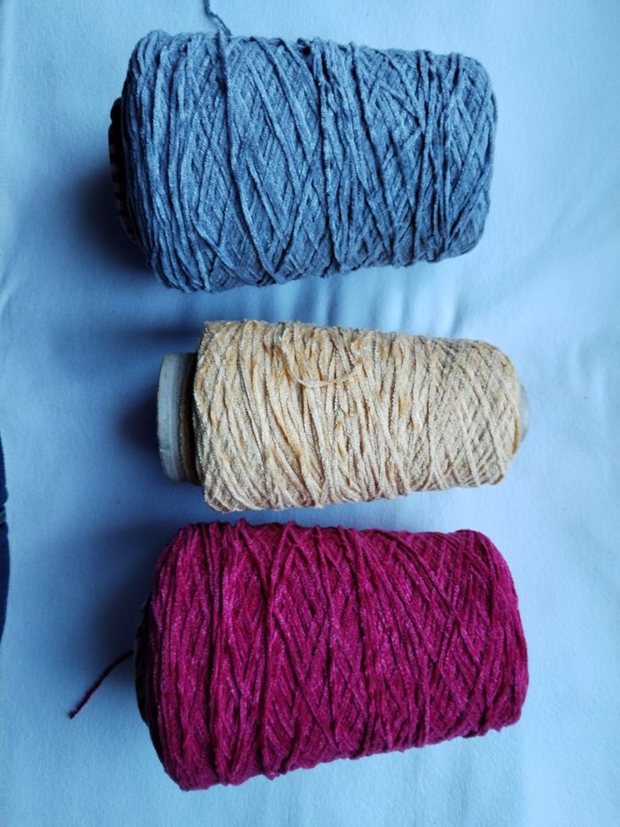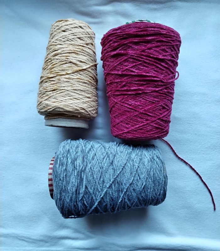 Lot de 3 cônes de fil type velours /chenille gris framboise jaune paille - photo numéro 1