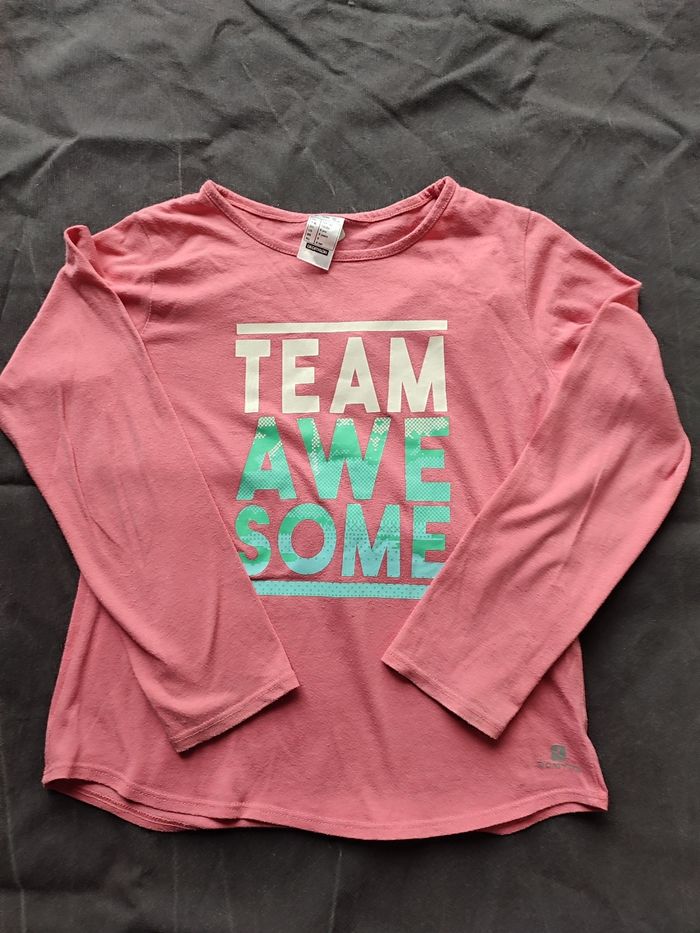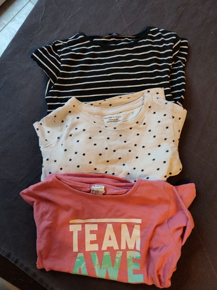 #iansolofille8ans T shirt rayé noir et blanc type marinière Kiabi 8 ans Bon Etat car quelques traces cf photo #iansolofille8ans T shirt rose manches longues imprimé uni avec une inscription "Team awesome" marque Decathlon État satisfaisant porté ( bouloches)et trace Composition polyester et coton #iansolofille8ans T shirt manches longues imprimé crème avec étoiles noire composition coton bio Marque monoprix kids État satisfaisant porté et quelques traces